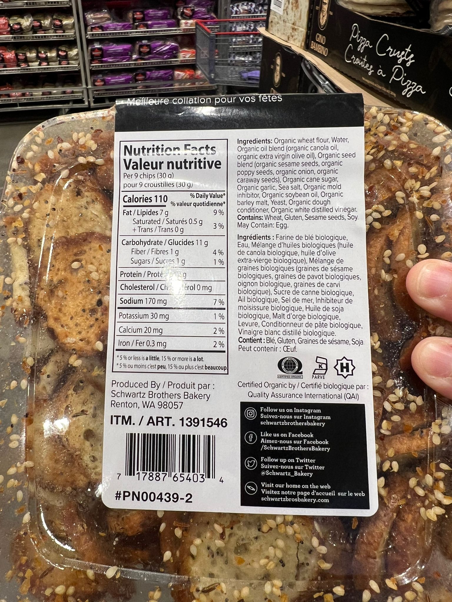 加拿大直送限時特價優惠中 Schwartz Brothers 有機零食脆425g 🔗歡迎網站落單 ❇️使用全有機食材 ❇️芝麻、黑樱米、洋蔥等烤成脆餅 ❇️直接食或配芝士都好正好香 * 讓您的餐點和零食更加美味—經過兩次烘烤,達到完美酥脆的口感。我們從零開始,只選用自己也會享用的食材。 * 大蒜香草本貝果脆片- 貝果脆片,加入烤蒜和香草,烘烤兩次而成。源自家族秘方,由我們的父母傳承並不斷完善,現在又呈現給您。 * 有機、猶太潔食認證純素(符合猶太潔食標準!)。採用優質原料製成,新鮮送達。 * * 百吉餅脆片有什麼用?幾乎什麼都能吃。可以加在沙拉、湯和零食裡。搭配起司拼盤和沾醬也很棒。或是直接從盒子裡拿出來吃也行。 📆12/19截 📆月尾左右到貨