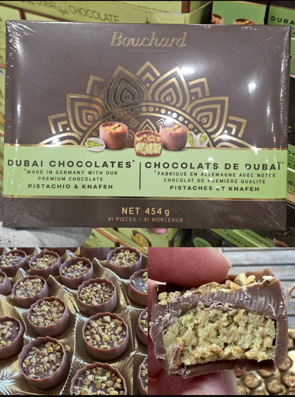 加拿大直送預購 Bouchard 杜拜開心果朱古力 (454g - 41 粒) 🔗歡迎網站落單 🤭終於等到佢返嚟一年只做一兩次減價 傳承自1931 年Bouchard 朱古力品牌,於德國🇩🇪精製而成 極度推介😍 Bouchard 杜拜開心果巧克力 這款話題十足的奢華甜點是以牛奶巧克力、開心果和酥脆的Kataifi 千層酥皮組成,內餡則是濃郁的開心果芝麻醬,外層包裹著絲滑的巧克力外殼,美國那邊可以說是搶購一空 口味偏甜,建議配咖啡配茶食用 開心果腦粉們或是想試試杜拜巧克力的可以來嚐鮮 ❇️濃郁的優質朱古力外殼包裹住絲滑既開心果cream + 極度酥脆的傳統中東Knafeh~ ❇️一啖咬落去,層次豐富、料十足! ⭕️約41粒