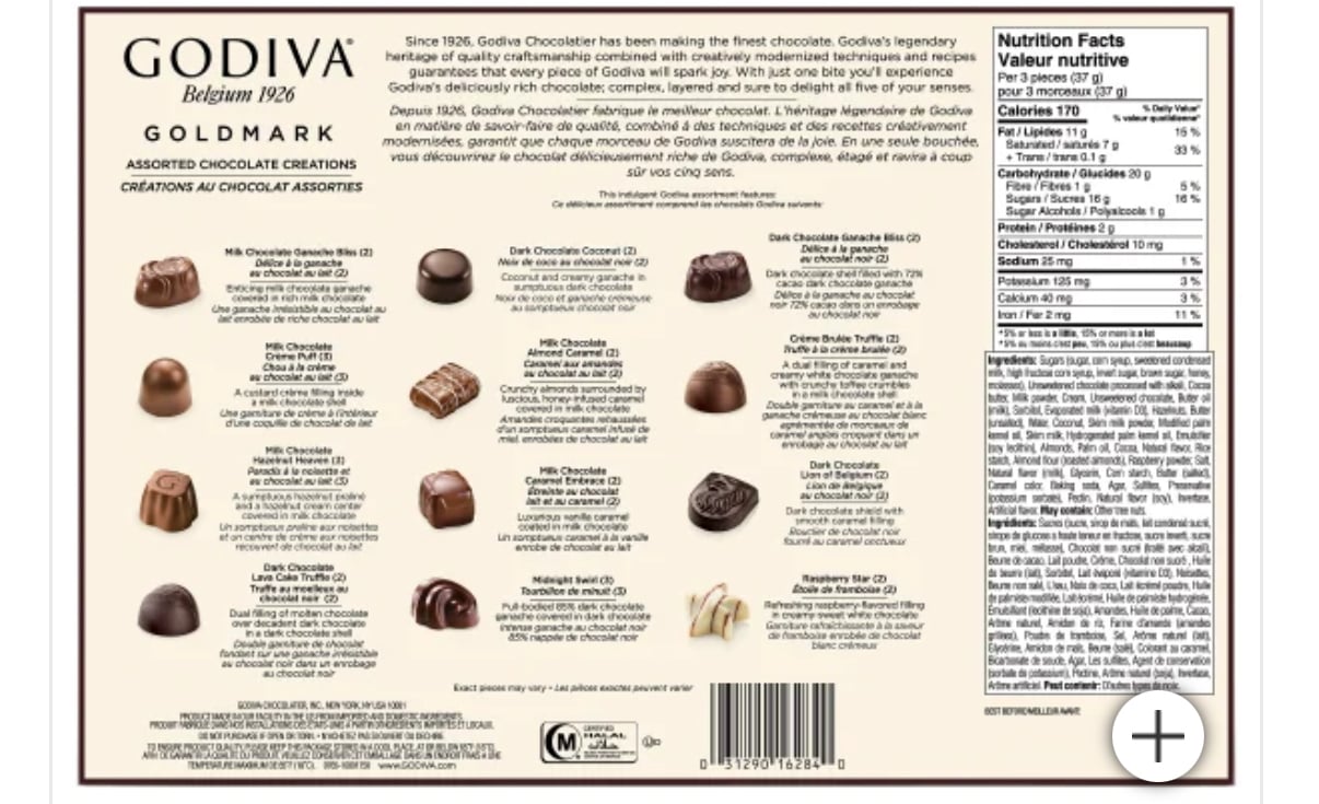 加拿大直送 特價中 Godiva 金裝皇牌朱古力禮盒(27粒裝) 🔗歡迎網站落單 ✂️截單日期: 11月21日✂️ 🗓預計到貨日:12月上旬後到 聖誕/新年禮盒必買推介 😍Godiva 朱古力皇牌Goldmark 禮盒過年送禮,大方得體💯 上年得9款口味,今年增到12款皇牌朱古力口味,一盒27粒,有齊晒Godiva 皇牌 12種口味包括: 1. Mike Chocolate Pecan Caramel Duet 2. Milk Chocolate Hazelnut Heaven 3. Dark Chocolate Ganache Bliss 4. Dark Chocolat Eclipse 5. Milk Chocolate Crème Puff 6. Crème Brulee Truffle 7. Dark Chocolat Coconut 8. White Chocolate Snowflake 9. Dark Lava Cake Truffle 10. Dark Chocolate Raspberry Velvet 11. Milk Chocolate Almond Caramel 12. Milk Chocolate Ganache Bliss 規格︰ 320g /盒 ( 27粒 ) 最佳食用限期:2026年8月