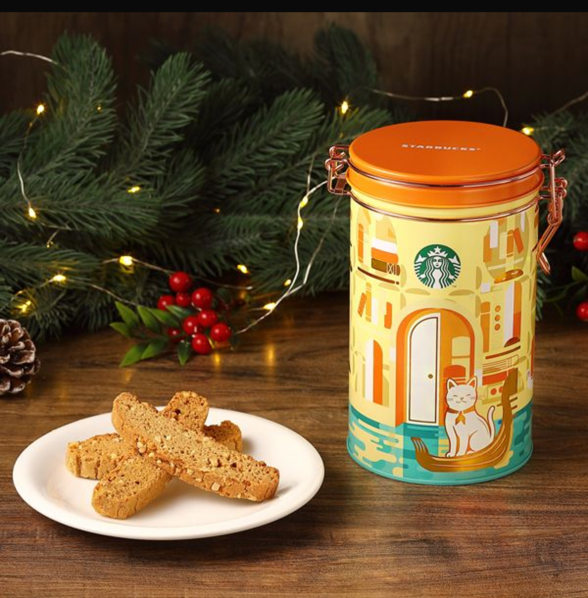 台灣直送台灣Starbucks聖誕系列 星巴克焦糖義式脆餅罐 🔗歡迎網站落單 經典義式Biscotti,微甜不膩,散發迷人的焦糖香氣,是咖啡的絕佳搭檔。包裝設計靈感源自貓都威尼斯,畫面巧妙融合當地最具詩意的書店風景,讓人彷彿沉浸在書香、咖啡香與焦糖香交織的氛圍中。每一口都是味蕾的旅行,細細品讀義式的美味篇章。 保質期:180天