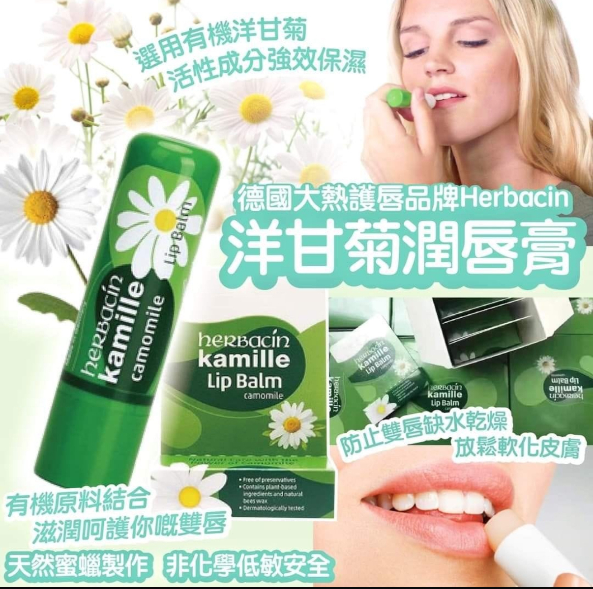 【德國Herbacin洋甘菊潤唇膏】 秋冬暖心推介 乾燥+長時間戴口罩…. 嘴唇乾燥龜裂仲流血c 敏感乾燥肌仲乾多幾錢重! 德國大熱! "Herbacin 洋甘菊潤唇膏4.8g 為唇部提供溫和護理+有效保護選用有機栽培原料•源頭安心有機洋甘菊米活性成分強效保濕防止雙唇缺水乾燥放鬆軟化皮膚天然蜜蠟製作,非化學低敏安全無防腐劑/化學抗氧化劑/人工色素X 皮膚科醫生認證 ◎ 敏感肌膚亦適用 德國大熱護唇品牌、秋冬必備之選有機原料結合L滋潤呵護你嘅雙唇 德國製造直送到港安心安全有效