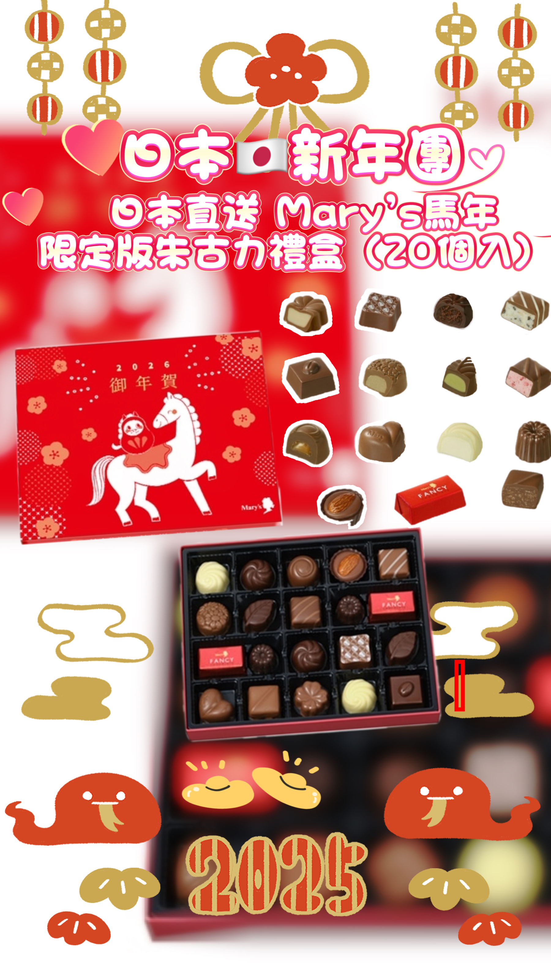 🧧新年禮盒🎁預購 日本🇯🇵新年團 🔗歡迎網站落單 日本直送 Mary's馬年限定版朱古力禮盒(20個入) 相信大家對日本Mary’s呢個牌子都唔會太陌生 品質保證,今年出左一款馬年嘅禮合,大紅色包裝非常吸引新年送禮啱晒仲要配上20粒不同口味嘅朱古力俾大家慢慢享受 📆07/2026食用日期 📆25/12截 3pm (26/12 公開發售) 📆1月中後到