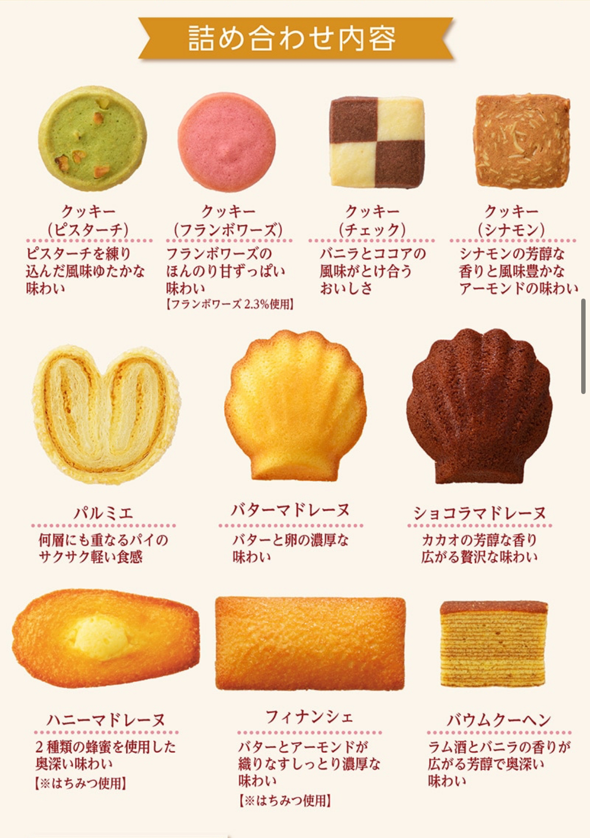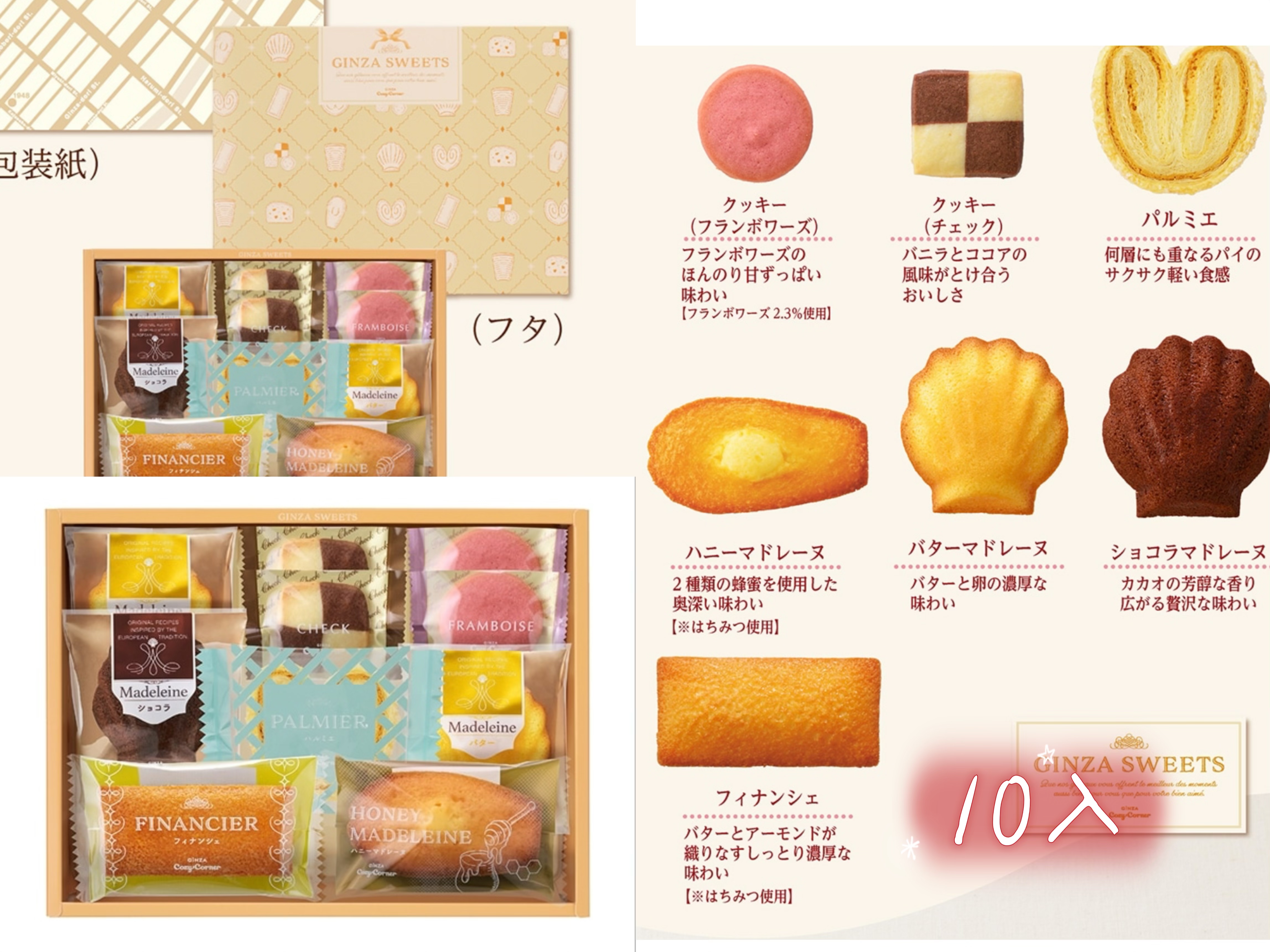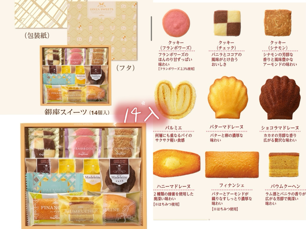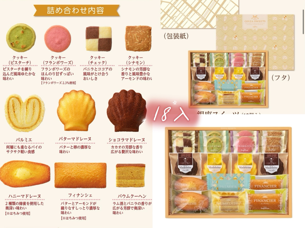 🧧新年禮盒🎁預購 日本🇯🇵新年團 【Ginza Sweet 精選】 日本 銀座Cozy Corner Ginza Sweet 精選 雜錦曲奇蛋糕 禮盒 10入/14入/18入 🏅連續五年 🏆Monde Selection Gold 2025 Food Awards 🔗歡迎網站落單 👍🏻豐富的烘焙美味😋 這款銀座甜品組合精心挑選了多種經典烘焙點心,讓您在一盒中品味各種風味。包括花朵形狀的馬德琳、香氣四溢的費南雪、果香四溢的水果蛋糕,以及酥脆的曲奇,帶來令人愉悅的口感體驗😍😍 ▸絕佳的味覺體驗👍🏻 每一種點心都使用了精選素材,無論是香滑的牛油🧈還是清新的水果🍎🍊🍓都完美融合,讓您在每一口中享受多樣的風味與口感。 仲有三個款式俾大家揀,趁而家早鳥優惠快啲入定貨啦🤭🤭 🔹10入 ・黃油瑪德琳2個 ・巧克力瑪德琳、菲南切、蜂蜜瑪德琳、帕爾馬各1 ・餅乾(覆盆子、格子)2個 ■尺寸:200mm×265mm×H43mm 🔹14入 ・黃油瑪德琳、巧克力瑪德琳各2個 ・菲南舍、蜂蜜瑪德琳、巴姆庫亨、帕爾米耶 各1個 ・餅乾(覆盆子、格子、肉桂) 各2個 一共14個 ■尺寸:221mm×260mm×H43mm 🔹18入 ・黃油瑪德琳、巧克力瑪德琳、菲南舍、蜂蜜瑪德琳 ・Baumkuchen,帕爾米耶 ・餅乾(覆盆子、格子、肉桂、開心肉) 各2個 各1個各2個共18個 ■尺寸:246mm×342mm×H43mm 📆6/1截 📆2月初到