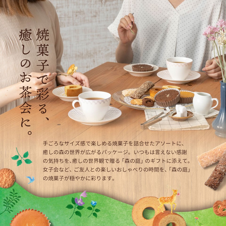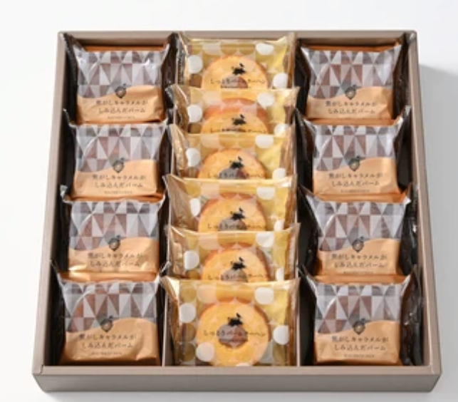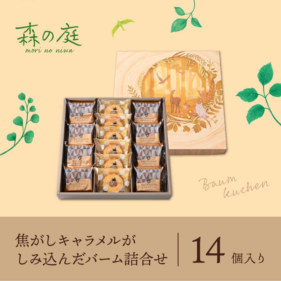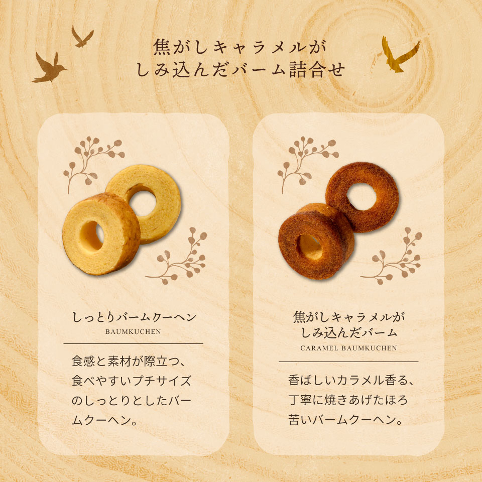 「森林花園」系列為您呈現充滿自然氣息的森林花園甜點。本款禮盒包含兩種口味的年輪蛋糕:「焦糖年輪蛋糕」和「濕潤年輪蛋糕」。 「濕潤年輪蛋糕」是將濕潤的年輪蛋糕裹上焦糖醬,撒上糖粉,再次烘烤而成。享受精心製作的美味。