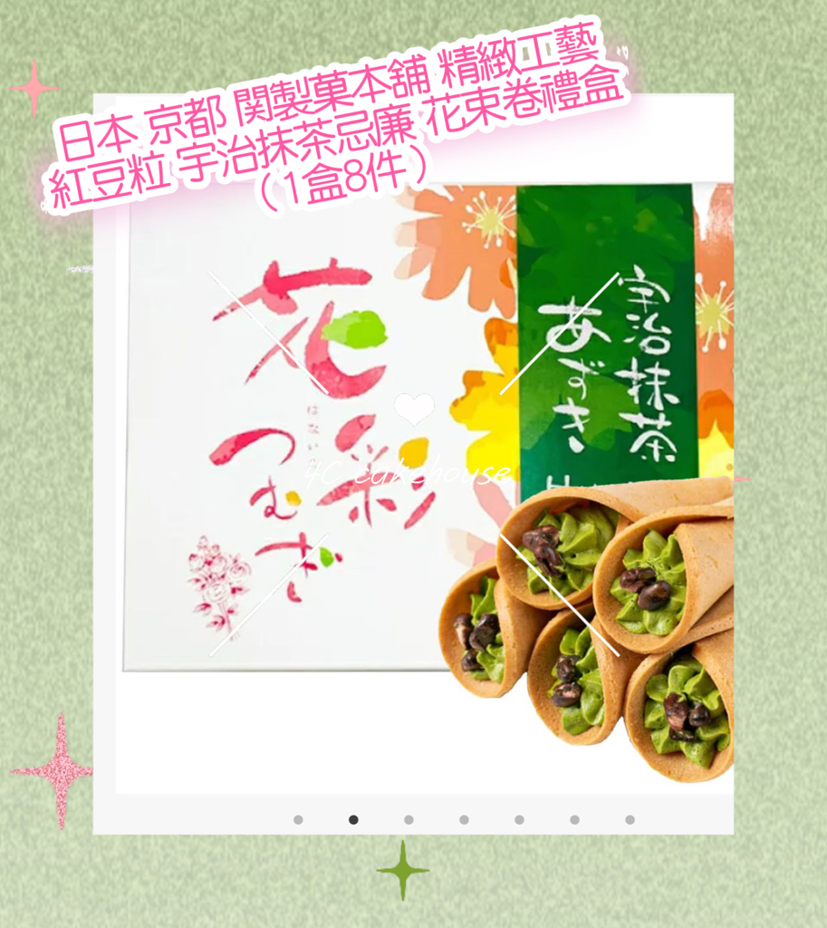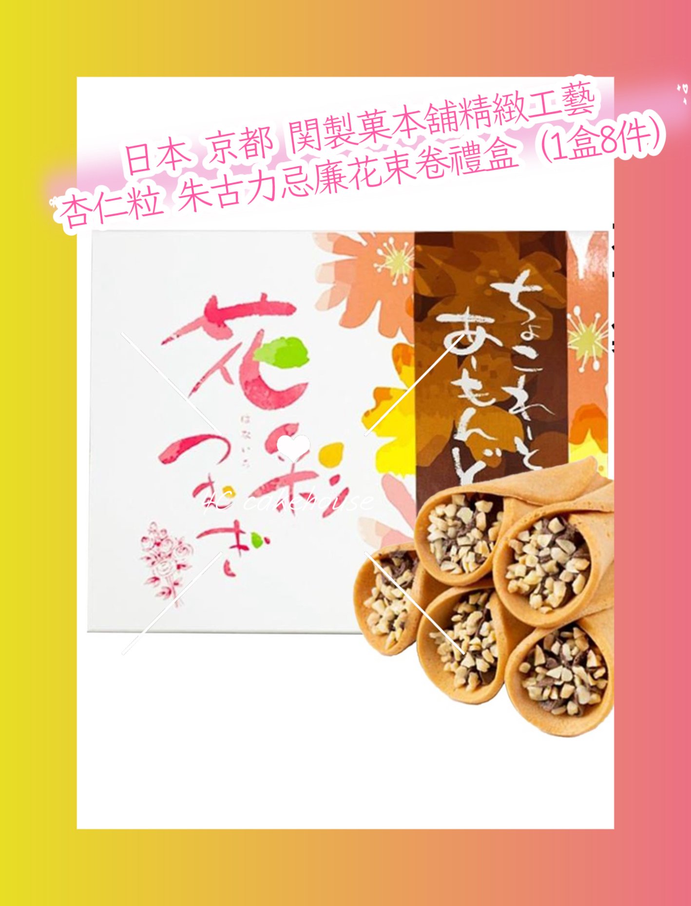 日本🇯🇵直送✈️ 日本 京都 関製菓本舖 精緻工藝 花束卷禮盒 三種口味可以選擇 🔗歡迎網站落單 A/三種乾果 雲呢拿檸檬忌廉 花束卷禮盒(1盒8件) 忌廉調配:香甜清爽 注入清爽的雲呢拿檸檬風味忌廉,帶來香甜爽口的絕妙滋味。 色彩繽紛:果乾點綴 以三種乾果作為點綴,宛如花束般絢麗多彩,提升視覺與味覺享受。 B/朱古力忌廉花束卷禮盒(1盒8件) 濃郁朱古力:絕佳口感 內含濃厚的朱古力忌廉,為口感增添豐富層次,帶來奢華享受。 杏仁點綴:口感豐富 搭配香脆的杏仁,咬下去充滿令人愉悅的脆口感,與朱古力忌廉完美融合。 風味融合:絕妙搭配 C/紅豆粒 宇治抹茶忌廉 花束卷禮盒(1盒8件) 濃郁宇治抹茶:正宗風味 注入濃厚的宇治抹茶忌廉,展現純正的日式風味,茶香撲鼻。 小豆點綴:和風極致 頂部點綴傳統小豆,帶來濃厚和風味道,完美平衡抹茶的微苦。 抹茶香氣:馥郁持久 日本新鮮空運伴手禮系列 人氣手信名店新鮮製作 手作業製作:精雕細琢 每個仙貝都由手工捲製,工藝精湛,質地鬆脆。 關製菓本舖精心設計和挑選每一種材料,保證產品的上乘品質,是送禮和自用的極佳選擇。 關製菓本舖品牌介紹: 自大正11年創業以來,老字號「關製菓本舖」一直專注於京煎餅的製造。「追求美味與安心•安全,創造顧客的笑容」和「通過製作點心貢獻於明亮和平的社會」是我們的理念。代代相傳,我們堅持品質,延續傳統。
