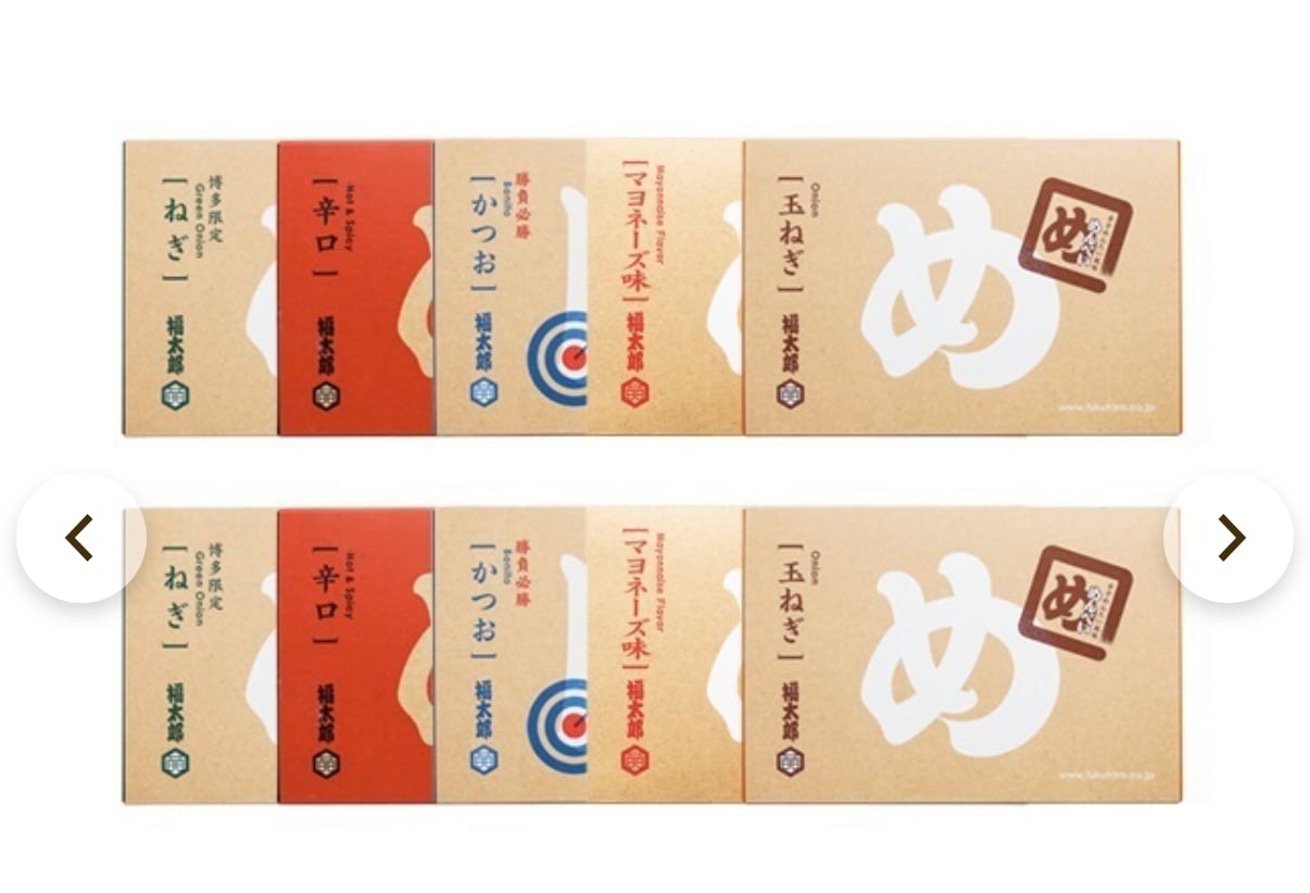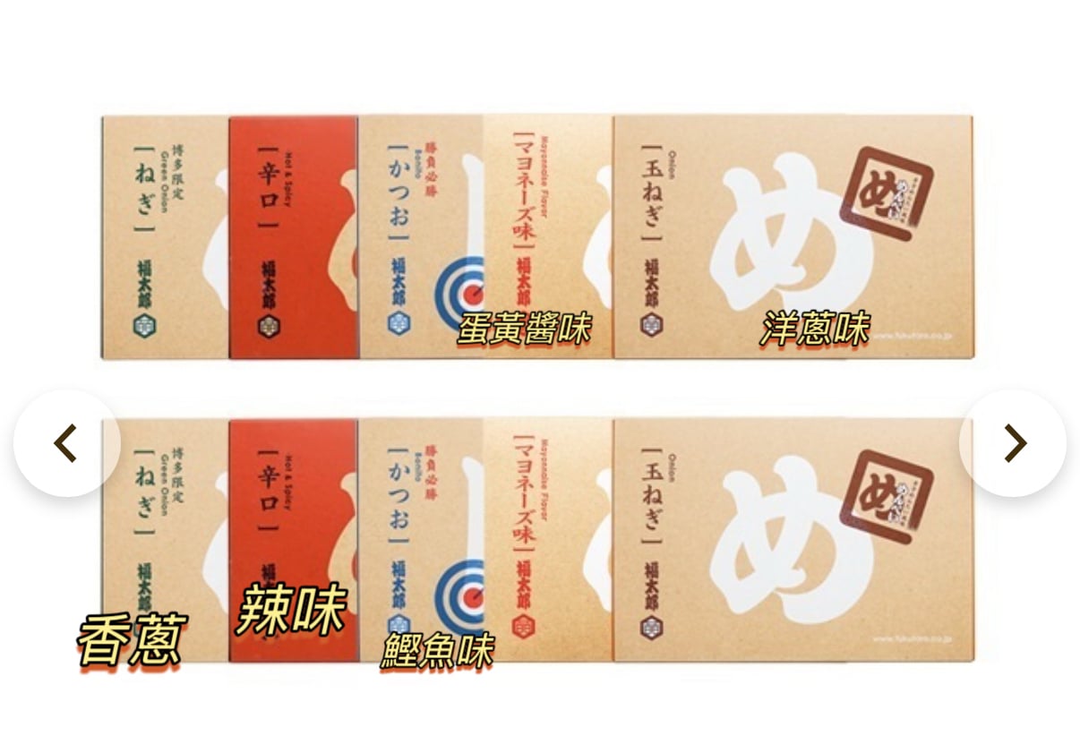 日本直送福太郎禮盒套裝 總共有五個口味 每一盒有八小包 每小包有兩塊 五個口味包括 🧡蛋黃醬味 💜鰹魚口味 💜蔥口味 ❤️辣味 💛洋蔥味 每樣有兩盒套裝為之10盒一個套裝 平均除開$4x@1盒 製造日より常温180日 歡迎網站落單 https://4ccakehouse.online/i/TgoYKrgAA