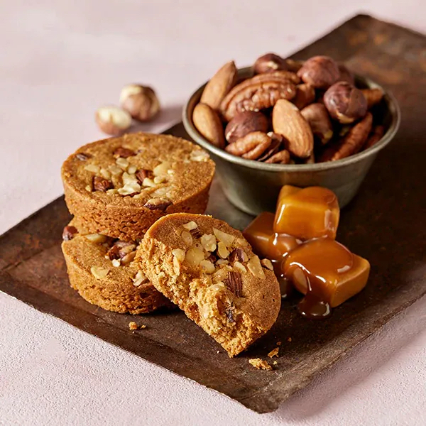 焦糖味濃鬱的厚餅乾,上面放有三種堅果。