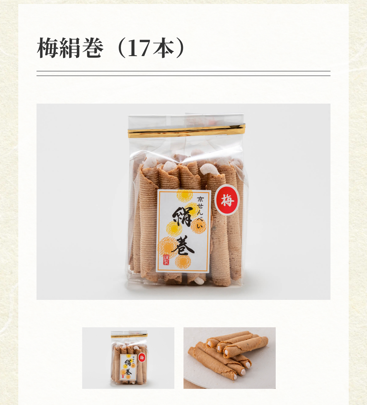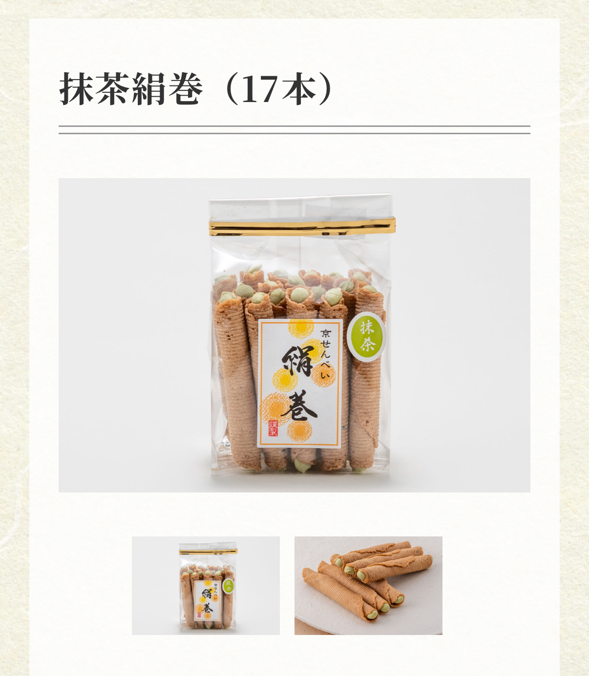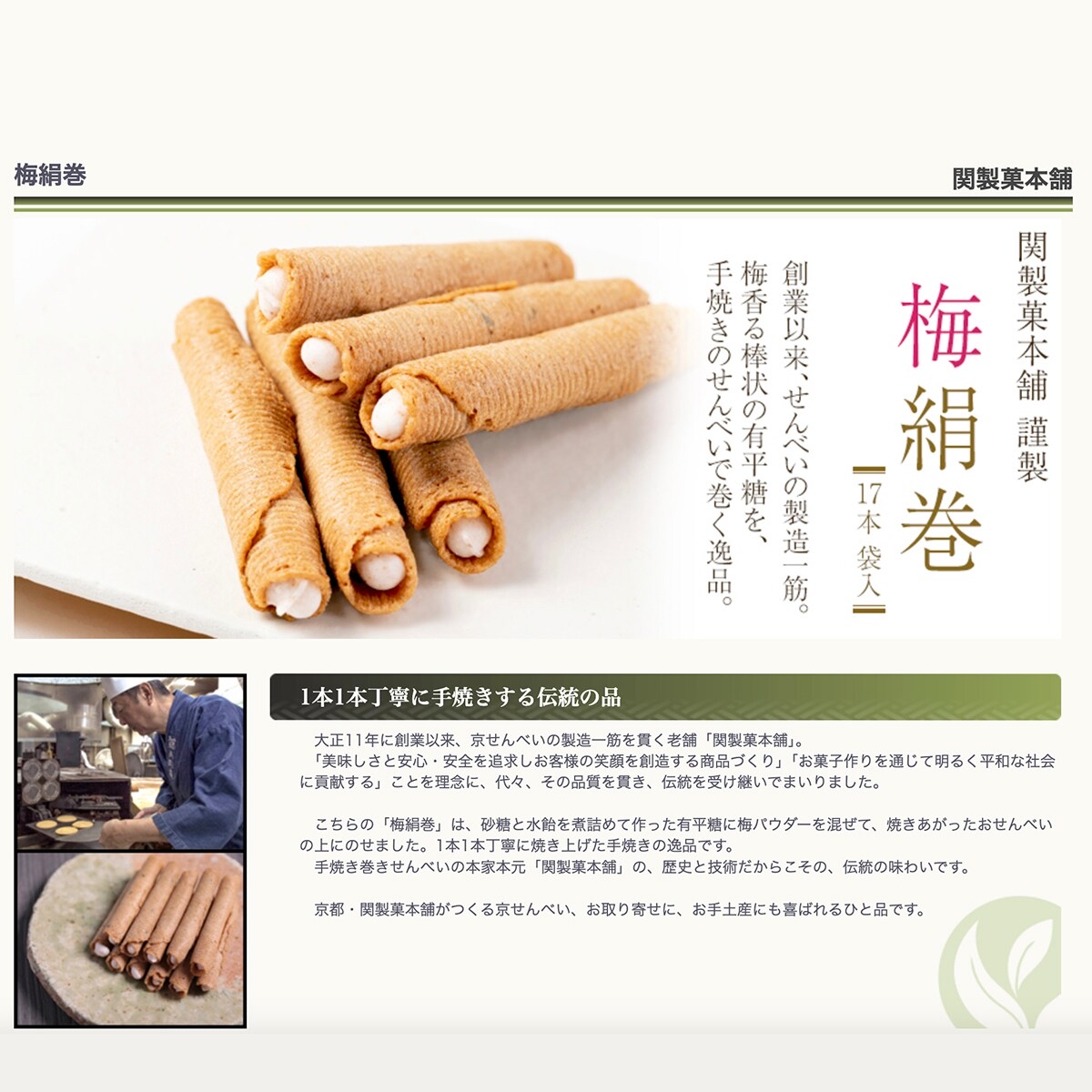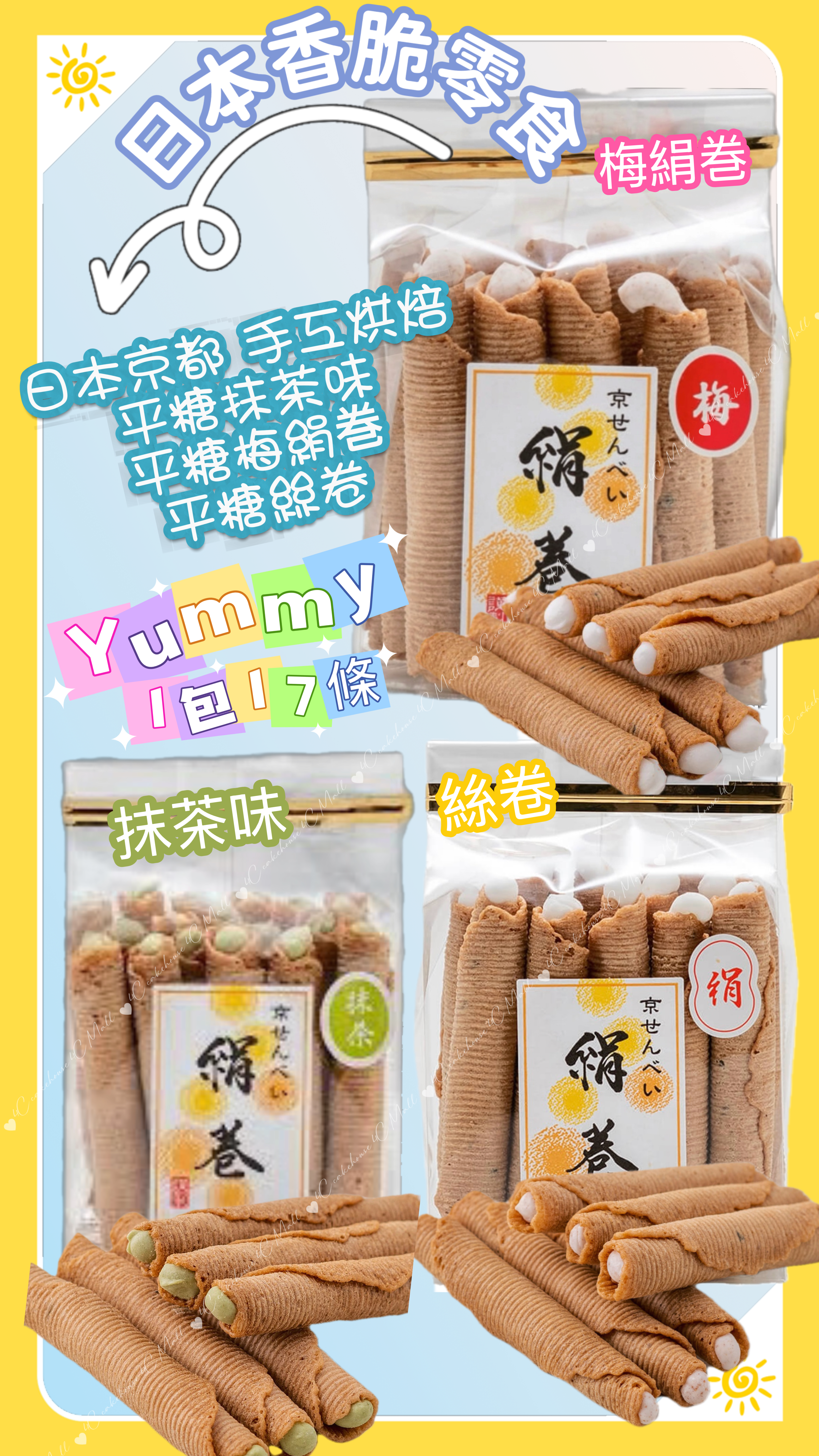 日本直送 日本 京都 関製菓本舗 手工烘焙 夾心絹巻 蛋卷 🔗歡迎網站落單 A/ 梅絹巻/17條1包 B/抹茶卷/17條1包 C/絲卷/19條1包 👍🏻人氣手信名店新鮮製作 A/▸ 梅絹巻:手工精製 砂糖與水飴煮製而成的有平糖,融合梅粉,覆於烘焙仙貝上,精緻而美味。 ▸ 酸甜平衡:梅粉風味 梅粉帶來的酸甜口感,與有平糖的甜蜜完美結合,清爽美味。 B/▸ 京都風味:傳統美味 嚴選京都宇治抹茶,傳統的烘焙技術,讓您品嘗到純正的京都風味。 ▸ 精緻甜點:特別享受 有平糖覆於仙貝之上,增添了其甜美與香脆,無論是搭配茶點還是單獨品嚐,都是一種難忘的味蕾享受。 C/絲卷淡淡的芝麻風味 將加了芝麻的餅捲成一圈圈,一根一根手工烤制而成。 有平糖的微軟口感和高雅的甜味,還有淡淡的芝麻風味的煎餅,是絕妙的精品。 📌▸手工製作:工藝嚴謹 關製菓本舗用心手工烘焙,每一片梅絹巻都凝聚了歷史與技術的結晶。 📌▸ 京都風味:傳統美食 採用京都傳統技術製作,品味純正京都風味,享受濃厚的文化氣息。 📌▸ 經典美味:名店之作 「關製菓本舗」的歷史與技術所打造的經典甜點,是不可錯過的絕佳美味。 📣關製菓本舗品牌介紹: 自大正11年創業以來,老字號「關製菓本舖」一直專注於京煎餅的製造。「追求美味與安心・安全,創造顧客的笑容」和「通過製作點心貢獻於明亮和平的社會」是我們的理念。代代相傳,我們堅持品質,延續傳統。 產品特色 手工烘焙 傳統美味 精緻呈現 📆10/12 截中午12點準時截單 📆預計到貨25/12左右 📆食用日期150天(按包裝上顯示)