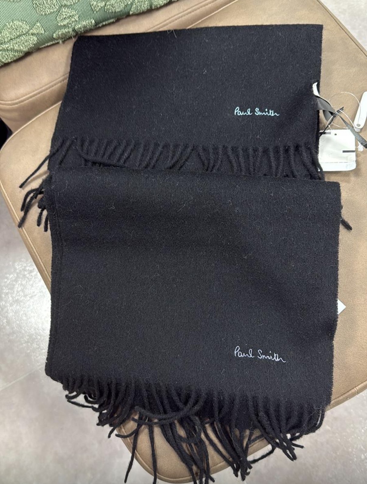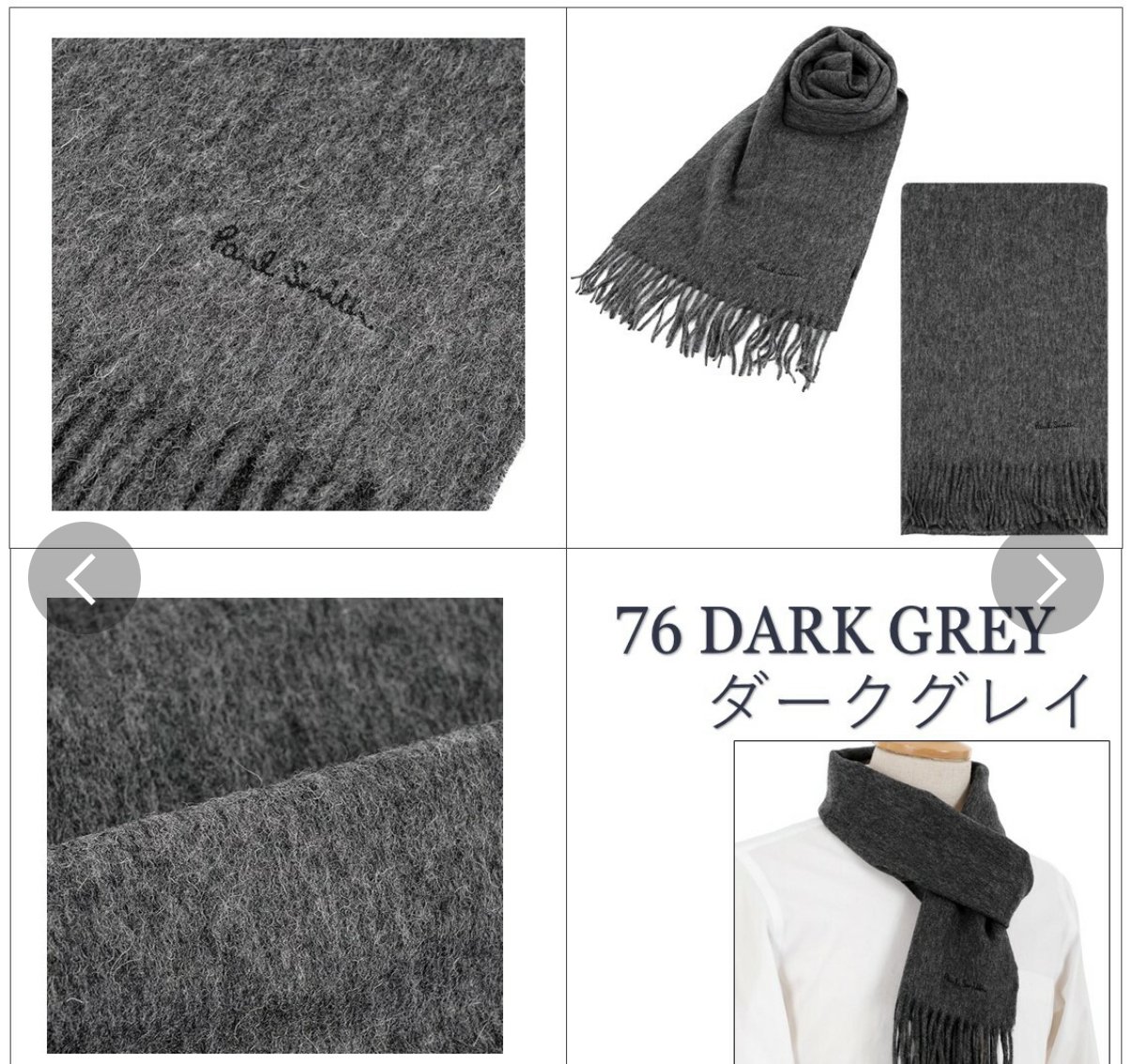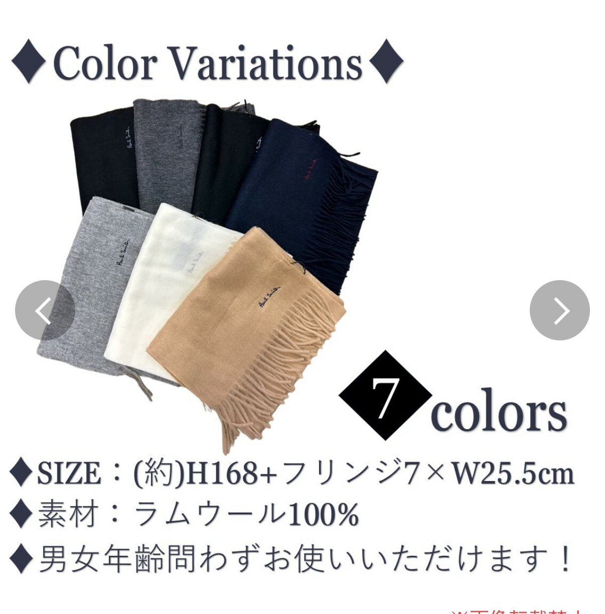 日本直送 聖誕🎄禮物推介 上次大阪日本團幫大家採購過呢個款口碑非常之好,今次再為大家推出價錢亦都係非常之靚仔,千祈唔好錯過仲有七個顏色俾大家揀 Paul Smith Paul Smith採用優質羊毛製成的純色圍巾。它柔軟舒適,配戴感極佳。簡約的設計以品牌標誌為中心,男女皆宜。無論是通勤上班還是上學,它都是理想之選,也是貼心的禮物禮物之選 產品名稱: Paul Smith 顏色 黑色:BLACK (79) 灰色:GREY (70) 炭灰色:CHARCOAL GREY (76) 海軍藍:NAVY (47) 米色:TAN/CAMEL (62) 酒紅色:BORDEAUX (28) 材質/規格 100%羊毛 尺寸 總長度(不含流蘇)x 寬度 x 流蘇寬度(公分) 均碼:166 x 25.5 x 7 人手量度尺寸亦都會有差誤大家留意