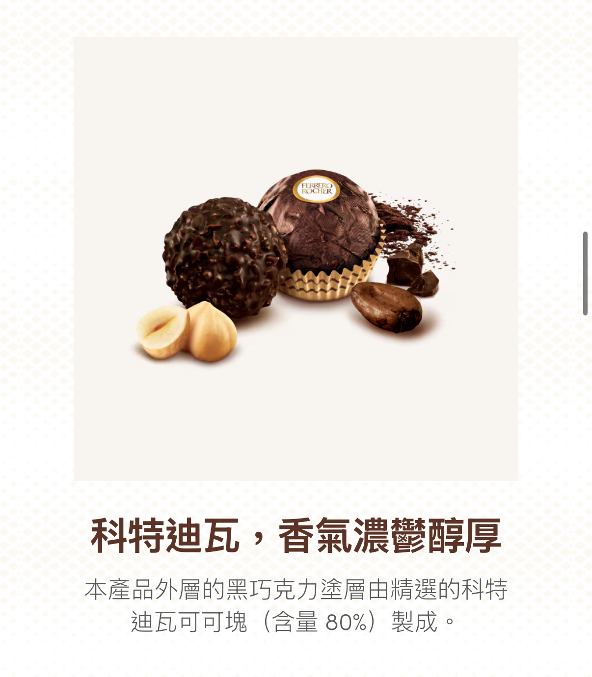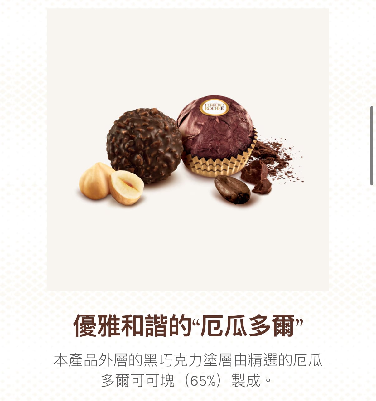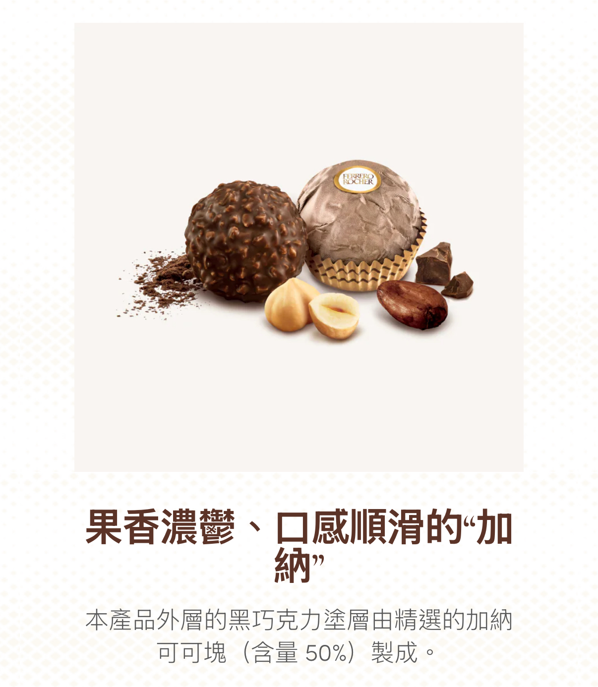 日本直送 Ferrero Rocher 36個 450-g 🔗歡迎網站落單,只有20盒現貨on the way中 來自日本嘅包裝36粒送禮大方得體,36粒包裝淨係日本先有😍 三種口味的什錦糖果。 香濃的榛果、滑順的餡料、芬芳的威化餅和榛果碎,外裹一層優雅的黑巧克力。 請盡情享受這充滿奢華感的美妙時刻,品嚐各種美味佳餚。 可可豆產地不同,味道也不同 加納 50%:口感醇厚的黑巧克力,帶有水果的清香,味道均衡,任何人都能輕鬆享用。 厄瓜多 65%:享受濃鬱的風味和醇厚的可可香氣。口感略帶苦澀,醇厚飽滿。 科特迪瓦 80%:這款正宗的黑巧克力具有濃鬱的可可香氣和強烈的苦味,讓您充分享受其豐富的風味。 一套豪華的 36 件裝: 12 件來自加納 12 件來自厄瓜多爾 12 件來自科特迪瓦,裝在一個盒子裡,讓您可以品嚐到各種口味。 奢華包裝:精緻的金色包裝使其成為送給愛人的完美禮物,或是犒賞自己的佳品。 推薦的食用和使用方法 直接品嚐:首先,直接品嚐每種巧克力。你會清楚感受到不同產地可可豆風味上的差異。 搭配咖啡或茶:黑巧克力的苦味與黑咖啡或純茶完美搭配,提升您的下午茶時光。 與葡萄酒搭配:特別是可可含量高達 80% 的科特迪瓦咖啡,與酒體飽滿的紅酒搭配,能凸顯兩者的風味,並創造出更豐富的口感。 儲存方法及其他 請置於陰涼乾燥處保存:避免高溫高濕。巧克力融化不會影響其品質,但風味可能會有所改變。 食用建議:36塊的量剛好適合與家人朋友分享。每天一塊,可以吃一個月以上。 產品特性 * 三種巧克力糖果的組合 * 柔和的榛果風味 * 精緻的黑巧克力塗層 * 與你愛的人一起創造一個特別的時刻 📆現貨,on the way只有20 📆1月初到