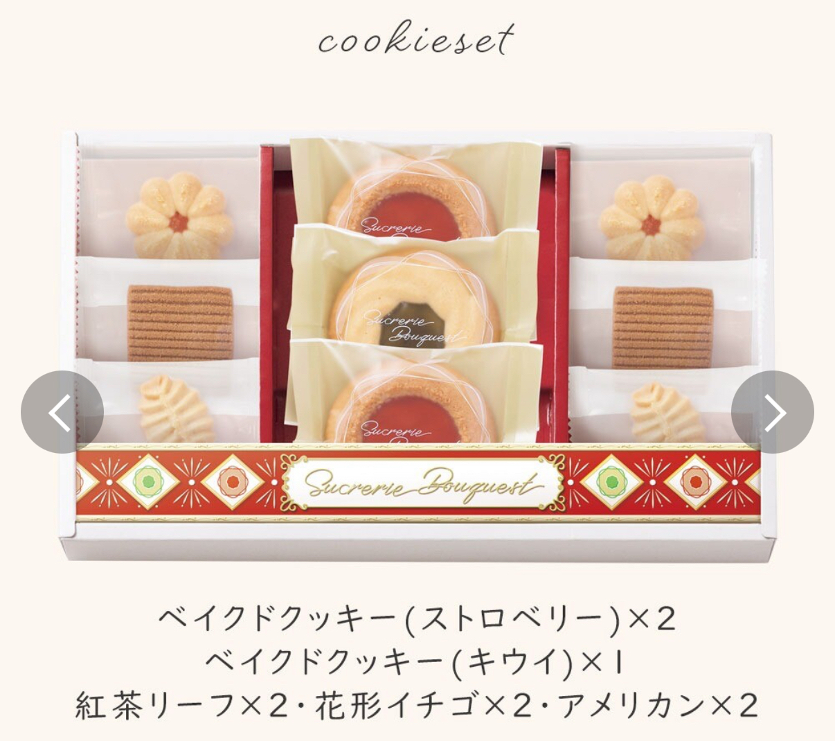 日本直送 Sucré Bouquet 烘焙餅乾套裝 烤了兩次的2種餅乾麵糰,裝飾了水果果醬等,樸素而令人懷念的餅乾套裝,多年來一直深受喜愛。 🔗歡迎網站落單 用既低調又味道濃郁的西式點心套餐給您帶來安心的時光。 內容物: 烤餅乾(草莓)×2・烤餅乾(奇異果)×1・紅茶葉餅乾×2・花型草莓餅乾×2・美式餅乾×2 📆28/11截3pm 📆12月中