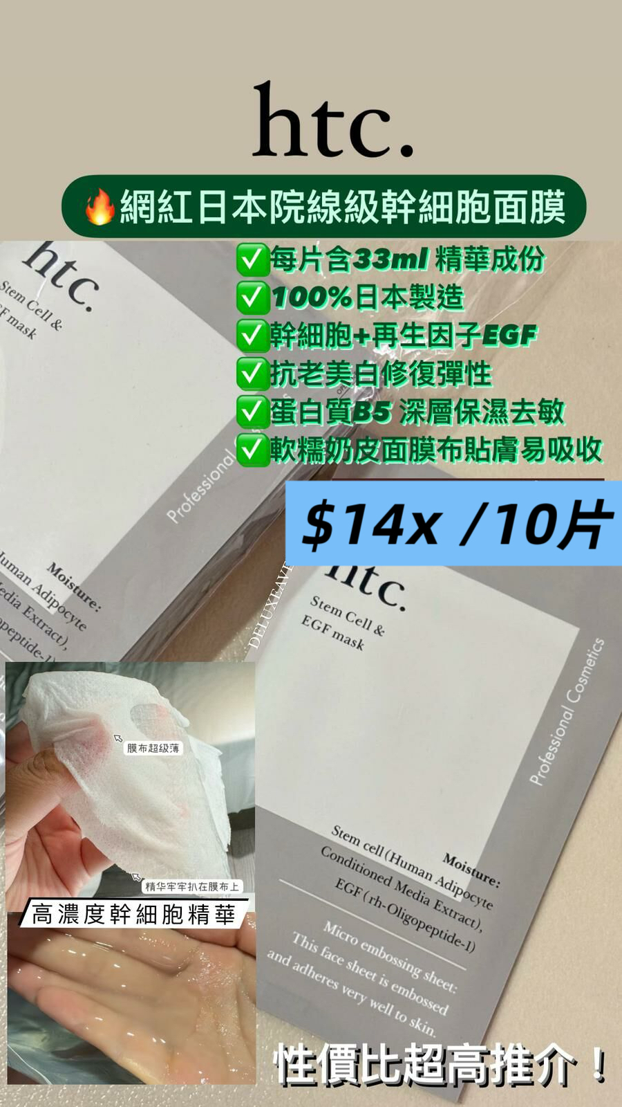 日本🇯🇵直送 🇯🇵日本熱賣🔥專業美容院專用 – HTC 幹細胞EGF面膜 單片/10片 借助幹細胞的力量打造充滿活力的肌膚 每片含有33ml 人體幹細胞萃取+EGF+多種維生素成分的濃密精華 注入滿滿水分,強補水保濕,皮膚飲飽水漲卜卜 修復受損屏障,提升肌膚防禦力、抗氧化及改善初老肌況、減退暗黃美白提亮 🥰特別推薦給乾燥肌 / 暗沉肌 🥰提升肌膚防禦力、抗氧化及改善初老肌況 💖減退暗黃美白提亮 ⭐主要成分⭐️ ▶️人類幹細胞提取物 ▶️EGF ▶️煙酰胺 ▶️維生素C ▶️維生素原B5 💌使用方法💌 1️⃣潔面爽膚後,展開面膜,將其貼近眼睛和嘴巴,然後取下網狀保護膜,將精華液均勻塗抹於整個臉部。 2️⃣停留約 10 至 15 分鐘。 3️⃣取下面膜,將精華液輕按吸收。 4️⃣最後塗抹乳液或面霜有助於保持水分。