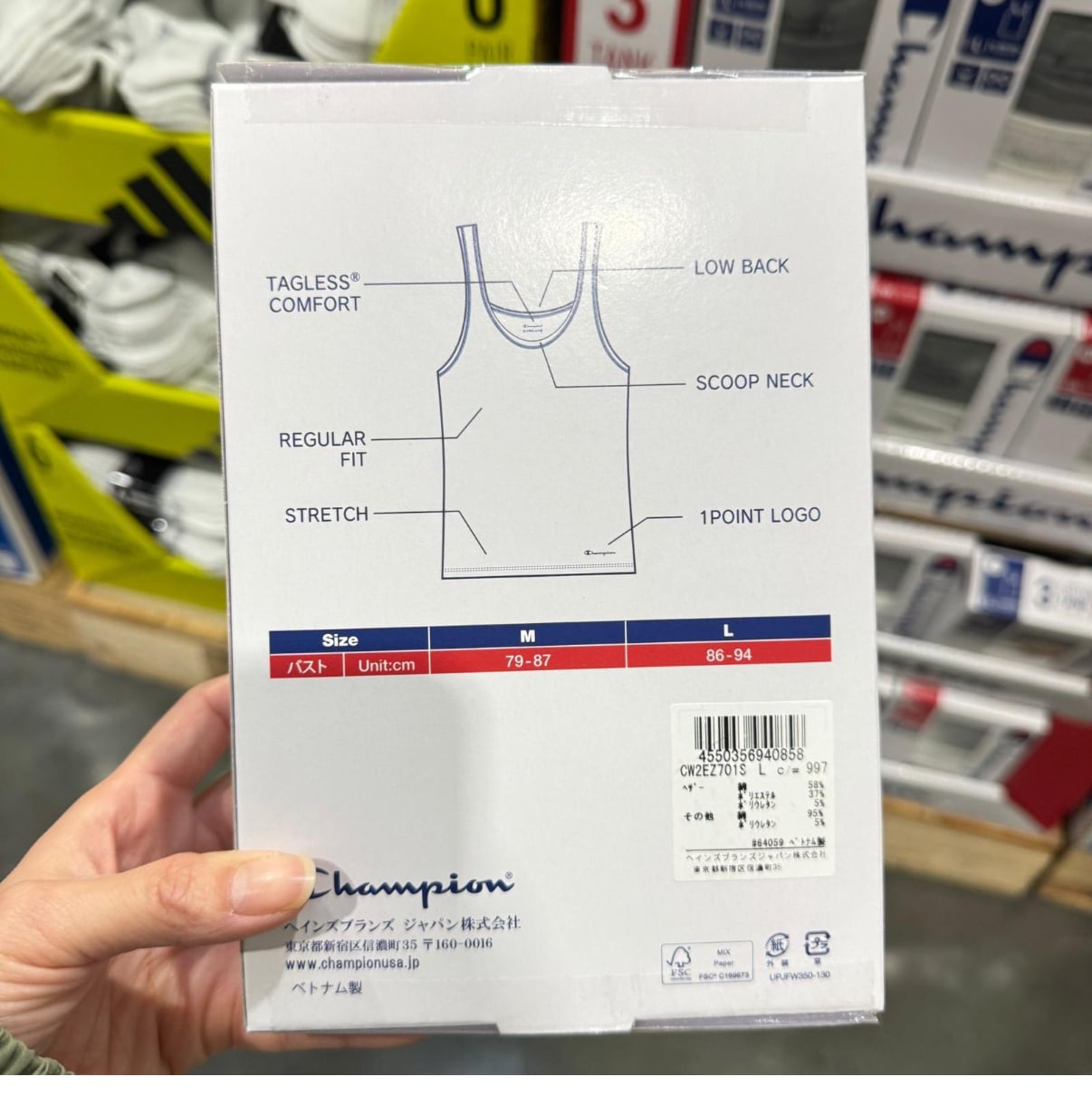 日本Costco直送 限時特價優惠中 日本直送 - Champion 混綿彈性 女裝背心 三件裝 🔗歡迎網站落單 日本直送 - Champion 混綿彈性 女裝背心 三件裝 低背,有彈性,寬領口,衫腳有LOGO,無標籤設計 三件裝,黑白灰各一 胸圍 M : 79-87cm L : 86-94cm 📆5/1截 📆20/1到