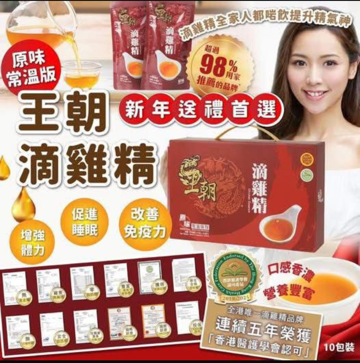 新年前最後一批舊價 📣📣現貨 🐔王朝滴雞精➡️補充9種人體必需的胺基酸和蛋白質,復原體力,增強體格🛡️ 🔗歡迎網站落單 王朝滴雞精🐔 – 原味( 常溫版 - 10包裝 ) #全港唯一滴雞精品牌👍 氣虛多病🤰🏻產後媽媽必備補身首選😍 ‼️連續兩年榮獲香港醫護學會認可既品牌滴雞精‼️ 💁🏻♀️為身體提供豐富膠原蛋白及九種人體必須的氨基酸,大補元氣、恢復體力‼️ 🧠改善大腦機能、加快創傷癒合 、促進消化加強脂肪分解‼️ ✅補身又補生 ✅加強脂肪分解 ✅82%有助改善手腳冰冷 ✅84%有助快速回復體力 ✅84%有助提升精神狀態 ✅超過98%用家推薦飲用 🦾100%全透明製作過程 國際衛生動線 🔸包裝內容:每包 60 ml x 10包 🔸產品外盒尺寸:26 x 17.5 x 7.5 cm