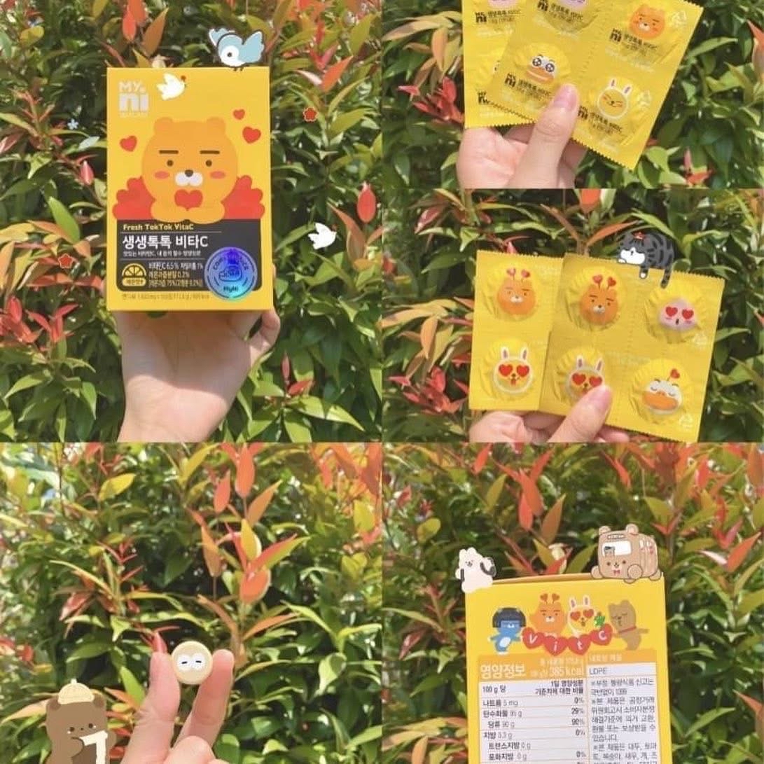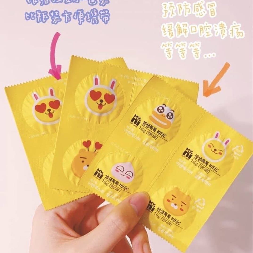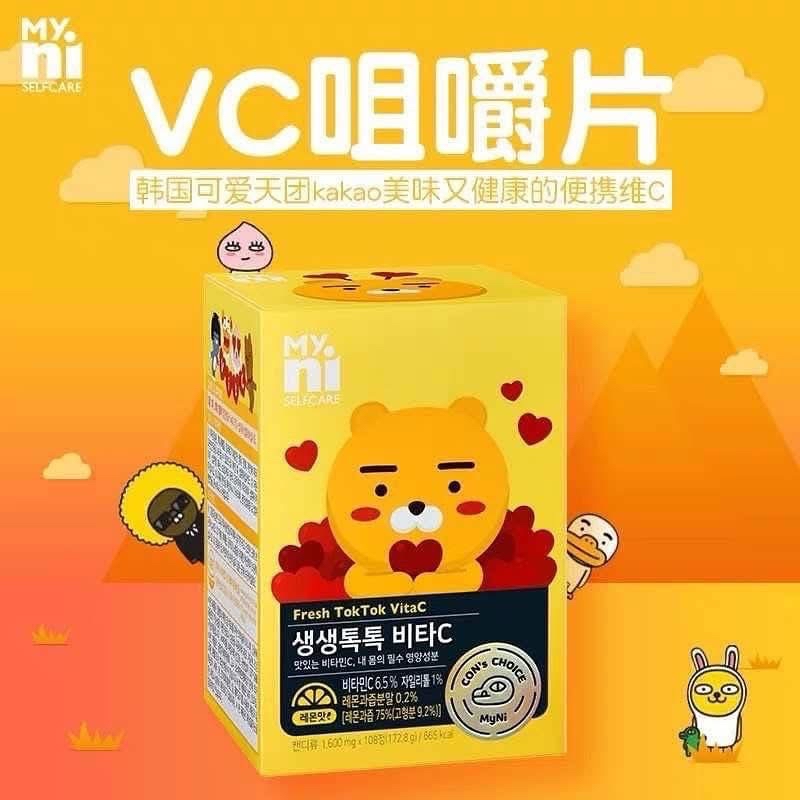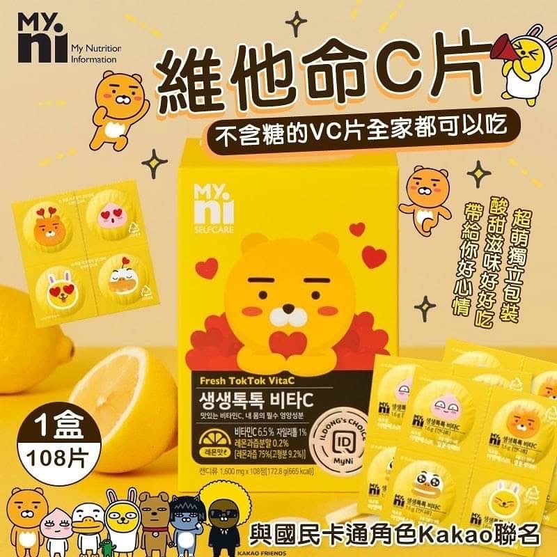 韓國直送 韓國 MYNI 萊恩維生C錠 108片 每天1-2片,隨時隨地補充VC! 攜帶方便 獨立包裝 天氣而家非常之唔穩定,冬天亦都係流感嘅高峰期,所以維他命C補充身體非常之重要,今次為大家介紹嘅韓國信心保證嘅品牌,大人小朋友都啱用😍可愛嘅包裝👍🏻!買定看門口非常不錯嘅選擇,帶出街亦都非常之方便 🔗歡迎網站落單 韓國本土老牌日東VC榮獲HACCP認證 推出與國民卡通角色Kakao Friends合作的包裝有別於傳統維他命補充品,非常可愛😍大多的維他命C都是做成吞錠對於長輩或小孩是非常不友善的因此韓國特別推出咀嚼錠~一邊咬一邊吃出維他命C的香氣酸酸甜甜檸檬香氣,好吃好吸收就像吃糖果一樣,一下子就補充所需營養~ ✅男女老幼都適合 ✅一錠一個包裝設計(方便攜帶) 每片含104mg的維他命C 沒有添加色素,不含蔗糖安全放心,不用擔心有蛀牙! VC濃縮的精華添加的是乳糖(嬰幼兒食品中的甜味調料)小朋友也可以吃! -成份:水溶性維他命C,維他命B3,B6, 木糖醇,草莓萃取物,李子萃取物,檸檬萃取物 不含蔗糖,甜味來自木糖醇 📆8/12 截12pm 📆16/12 到