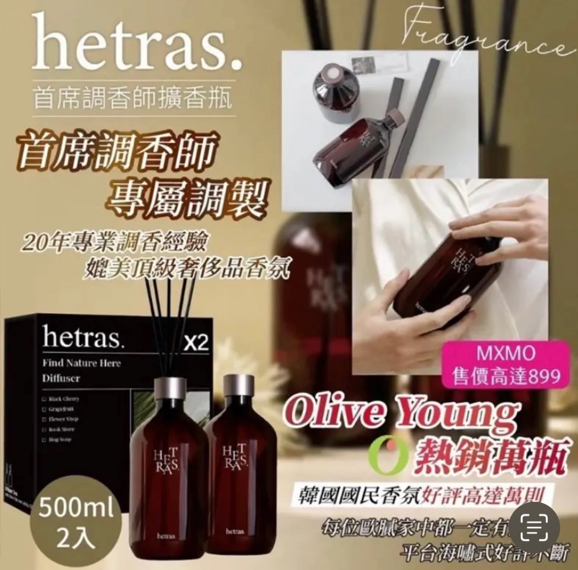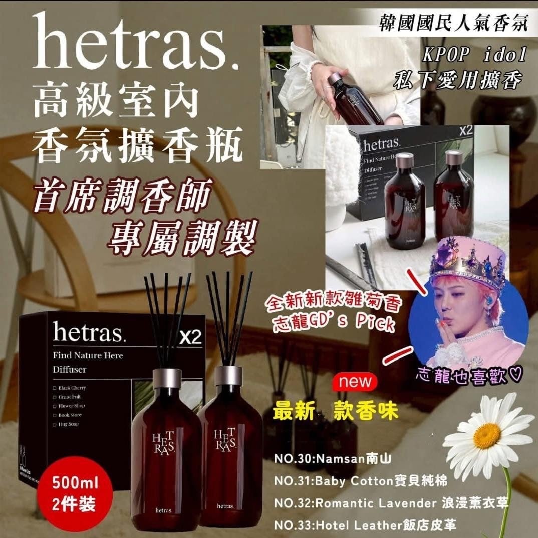 韓國🇰🇷Hetras飯店療癒極致擴香 (500ml x 2) 韓國Hetras品牌直送~ 🌟GD權志龍推薦的香氛保養品牌 🔥 強烈推薦,一定要跟上這個品牌!韓國Hetras 💯迷人香氣,總有一款讓你愛上!500ml超大容量香薰👍 💰原價$14x 📣年終優惠$12x 買兩套再減$10 🔗歡迎網站落單買兩套更優惠 💰 CP值超高,擴香效果極好,不用擔心香味太快消失。 🟡8款香氣選選: Black Cherry (黑櫻桃 - 甜美果香) Grapefruit (葡萄柚) La Tulip Shower (沐浴鬱金香) Hotel Wood (五星級飯店) Daisy (雛菊-志龍GD‘s Pick) Baby Cotton (嬰兒棉) Romantic Lanvder (浪漫薰衣草) Flower Shop(花園) 🌿 溫和不嗆鼻,每款香氣都層次豐富,讓家裡的味道更有質感,擴香效果極好,不用擔心香味太快消失,全室充滿療癒氛圍😍 #Hetras#GD#五星級飯店#正品正貨