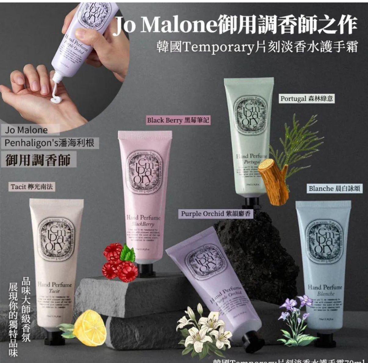 韓國Temporary片刻淡香水護手霜70ml 1套2支 😱超級黐線嘅價錢 用嚟交換聖誕禮物都一流放喺手袋亦都一個不錯嘅選擇隨時都用得,最緊要性價比高❤️ 呢個牌子大家都唔陌生👍🏻 小編做過聖誕優惠價俾大家,一套有2支 ⭕️$29@1 set $100@4set 🔗歡迎網站落單 A. Black Berry 黑莓筆記 B. Blanche 晨白詠頌 C. Portugal 森林綠意 D. Tacit 檸光南法 E. Purple Orchid 紫韻麝香 🌸香氣留在手心裡,也留在每個溫柔瞬間。 香氣,是最能喚起記憶的魔法。 TEMPORARY 將「香氛 × 回憶」融入護手保養, 讓每一次塗抹,都像是一場專屬於自己的療癒時光✨ 質地輕盈柔潤💧不黏膩、不厚重, 一抹即吸收,留下持久又高級的淡淡香氣。 無論是辦公、約會、睡前時光,都能讓香氣成為妳的專屬標誌💫 🩷共有五種香氣,隨心挑選妳的當日心情香: 🌸 Black Berry 黑莓筆記|果香甜中帶點木質氣息,像戀愛剛萌芽的悸動。 🤍 Blanche 晨白詠頌|白花與香草的清新氣息,乾淨又溫柔。 💚 Portugal 森林綠意|柏樹與岩蘭草的氣息,像漫步在陽光灑落的森林。 🍋 Tacit 檸光南法|柚子、檸檬與檀香融合的清爽香氣,喚醒每個疲憊午後。 💜 Purple Orchid 紫韻麝香|細緻花香交織蜜桃與麝香,浪漫又高雅。 👋輕抹雙手,瞬間被香氣包圍~ 柔嫩保濕、香氣療癒、氣質滿分💫 讓每一次護手都成為「取悅自己」的小儀式。 🌸 Black Berry 黑莓筆記 -TOP前調:黑莓 果香四溢,帶來微妙的神秘感,清爽中透著甜美,活力滿滿 -MIDDLE中調:月桂葉 新鮮的草本氣息,讓人想起陽光灑落的午後,清新又舒心 -BASE後調:雪松、香根草 溫暖而穩重的木質基調,為整體香氣增添深度與細膩感 🤍 Blanche 晨白詠頌 TOP|醛香、粉紅胡椒、清新臭氧、仙客來 🌿✨ → 乾淨澄澈,像打開窗戶迎來的晨光微風。 MIDDLE|玫瑰、玉蘭、牡丹、紫羅蘭、茉莉、鈴蘭 🌸💐 → 層層疊疊的花香,像晨間花園裡的盛放合奏。 BASE|麝香、檀香、香草 🪵🍨 → 後調溫柔,帶著奶香般的甜與木質沉穩,留下安心的尾韻。 💚 Portugal 森林綠意 TOP|柏樹、安息香樹脂、佛手柑 🌿🍋 → 清新爽朗的綠意氣息,像晨露沾葉的森林空氣, 帶著陽光灑落枝頭的透亮感。 MIDDLE|薰衣草、天竺葵、岩玫瑰 💐🌾 → 花草香交織的平衡調,柔中帶著草木的溫度, 彷彿漫步在被陽光溫暖的山林小徑。 BASE|雪松、檀香、廣藿香、岩蘭草、琥珀、麝香 🪵🌕 → 尾韻沉靜而溫潤,木質與琥珀交融出深層安定感, 在一呼一吸之間,回歸自然的平靜與從容。 🍋 Tacit 檸光南法 🌿前調|柚子、檸檬、葡萄柚、柳橙、羅勒、尤加利、薄荷 如晨光灑落的柑橘果香,清爽開場,自帶陽光般的愉悅氣息。 🌸中調|鈴蘭、玫瑰、迷迭香、丁香 細膩花香浮現,溫柔綻放,如午後微風中的一抹嫵媚與柔情。 🌲後調|雪松,檀香,琥珀,香根草 沉穩木質包裹著甜蜜尾韻,低調中展現中性魅力。 💜 Purple Orchid 紫韻麝香 TOP|Floral, Agrestic 🌸🌿 → 初聞宛如花園甦醒,清新自然。 MIDDLE|Orange Blossom, Heliotrope, Peach 🍊🍑 → 橙花與含羞草的溫柔,交織蜜桃的甜美,愈聞愈著迷。 BASE|Powdery, Musk, Wood 🪵 → 麝香與木質溫暖收尾,像一場夢境留下的柔軟餘韻。 產地:韓國製造