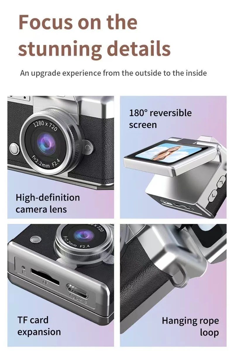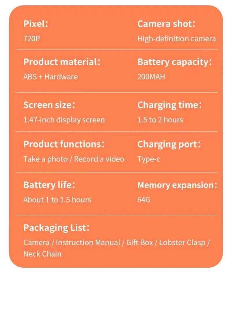 預購LK-027 反Mon拇指相機|CCD 迷你相機 反Mon超迷你復古數碼相機 🔗歡迎網站落單 商品簡介: 復古高清螢幕迷你CCD翻轉自拍相機,適用於Vlog和適合初學者和學生的攝影。 它既是相機又是吊墜。它輕巧便攜,因此您可以隨時隨地拍照 提供多種美顏濾鏡供您選擇,輕鬆打造各種風格和氛圍 翻轉自拍螢幕,支援多角度拍攝,操作絲滑流暢 超清晰拍攝/錄影,讓每個瞬間都清晰生動 高亮度補光燈,無懼弱光環境 這只是玩具級數,不能與專業攝影器材兼美 顯示幕:1.47吋高清顯示屏 (可揭180°自拍) 照片解像度:4800萬像素 影片解像度:1920x1080p 電池:200MAH 語言:16種選擇 影片格式:AVI 充電時間:約 1.5 - 2小時 電池續航力:約 2小時 充電方式:Type-C 接口 (DC 5V) 產品尺寸:51.97 x 25.98 x 36.49 mm LED閃光燈:內置 顏色:白色,黑色,橘色,棕色,黃色,綠色,紫色,藍色,粉紅色 包裝清單:相機 x1,說明書 x1,龍蝦扣 x1,吊飾 x1 Type-C線充電 *需要另外購買 最大支援 64GB Micro SD卡 *需要另外購買 產品保養 此產品為平行進口貨品。 此產品不設保養。 產品詳情全部在網站中可以參考謝謝