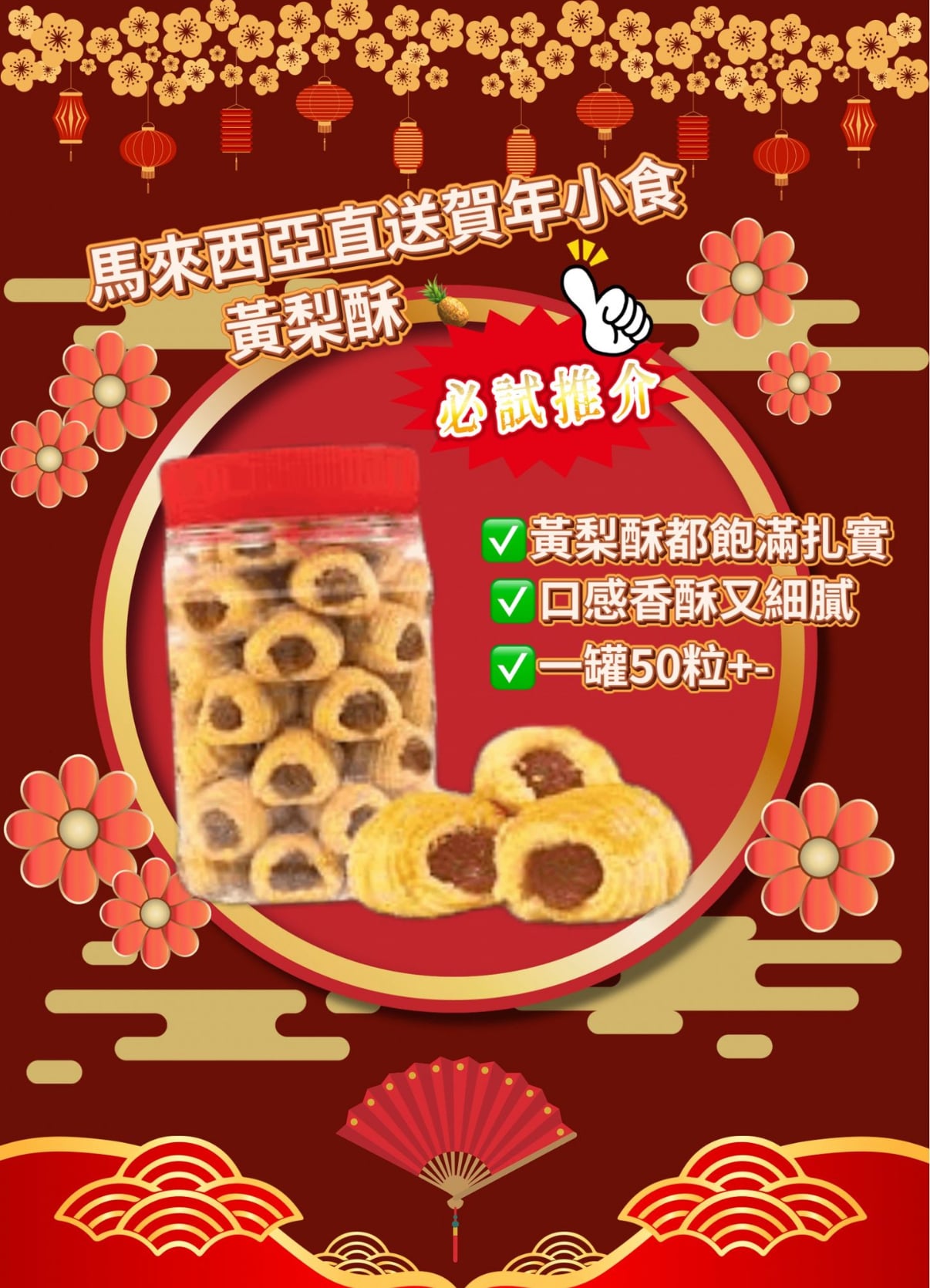馬來西亞直送賀年小食 I黃梨酥 🍍 🔗歡迎網站落單 每一口都是住家純手工的用心之作,香酥不甜膩,吃了還想再來😋 新鮮出爐,香味撲鼻,剛剛好的甜度讓你一吃就停不下來😍 嘗過的顧客都忍不住點贊,咬下去滿滿的幸福感💕 每顆黃梨酥都飽滿扎實,口感香酥又細膩,絕對讓你吃得超滿足👌🏻 ✅一罐50粒+-