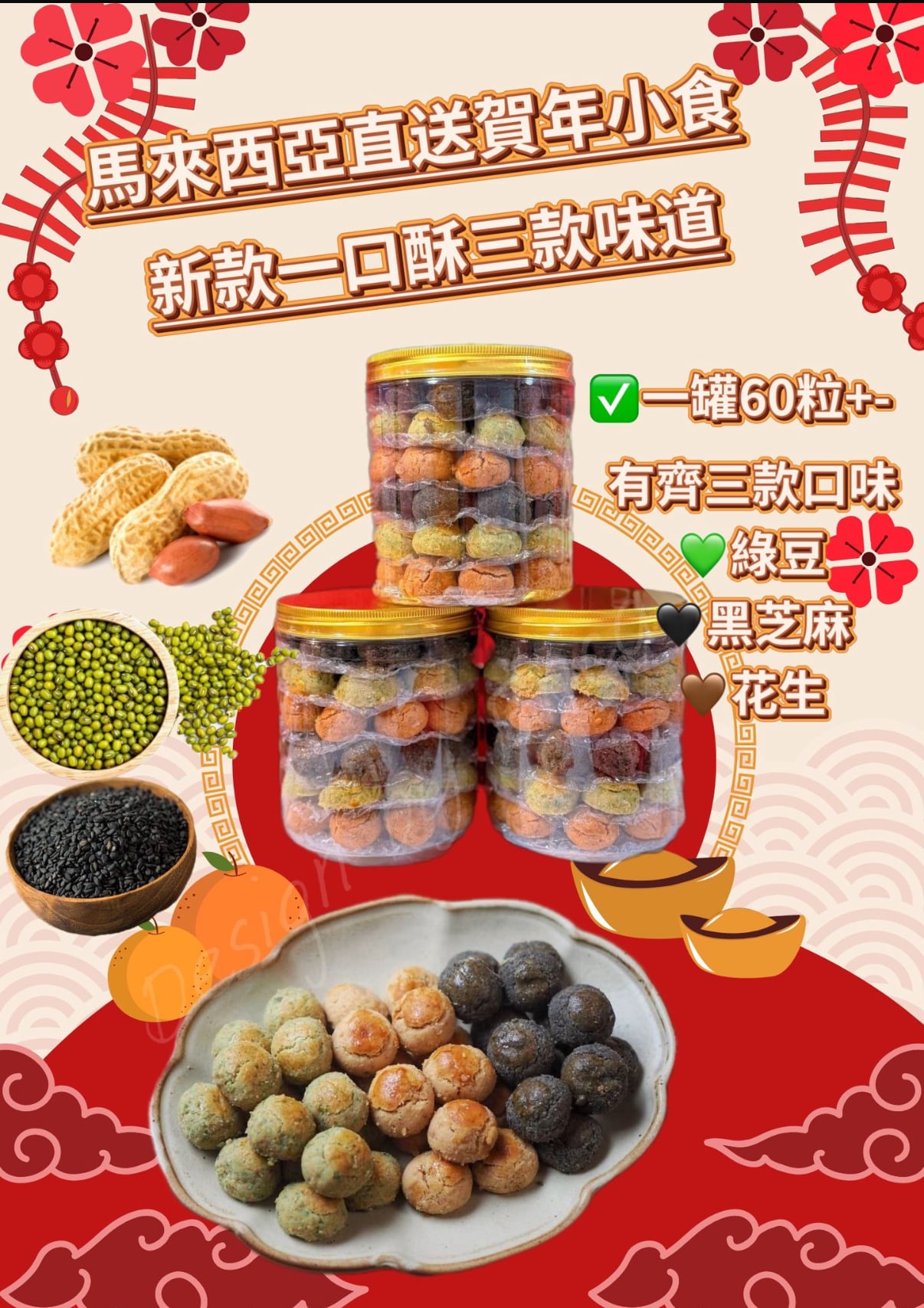 馬來西亞直送馬來西亞賀年小食 F新款3in1一口酥 想要一次過解鎖三種經典美味嗎?🔥 3in1 一口酥來襲!✨ 一罐包含綠豆酥、花生酥、黑芝麻酥,滿足你所有的渴望,又酥到停不下來!😎 全部都是住家手工製作,每一口都香酥入心,保證讓你吃了還想要更多!😋 🔗歡迎網站落單 ✅一罐60粒+- 📆10/1截 📅25/1前到