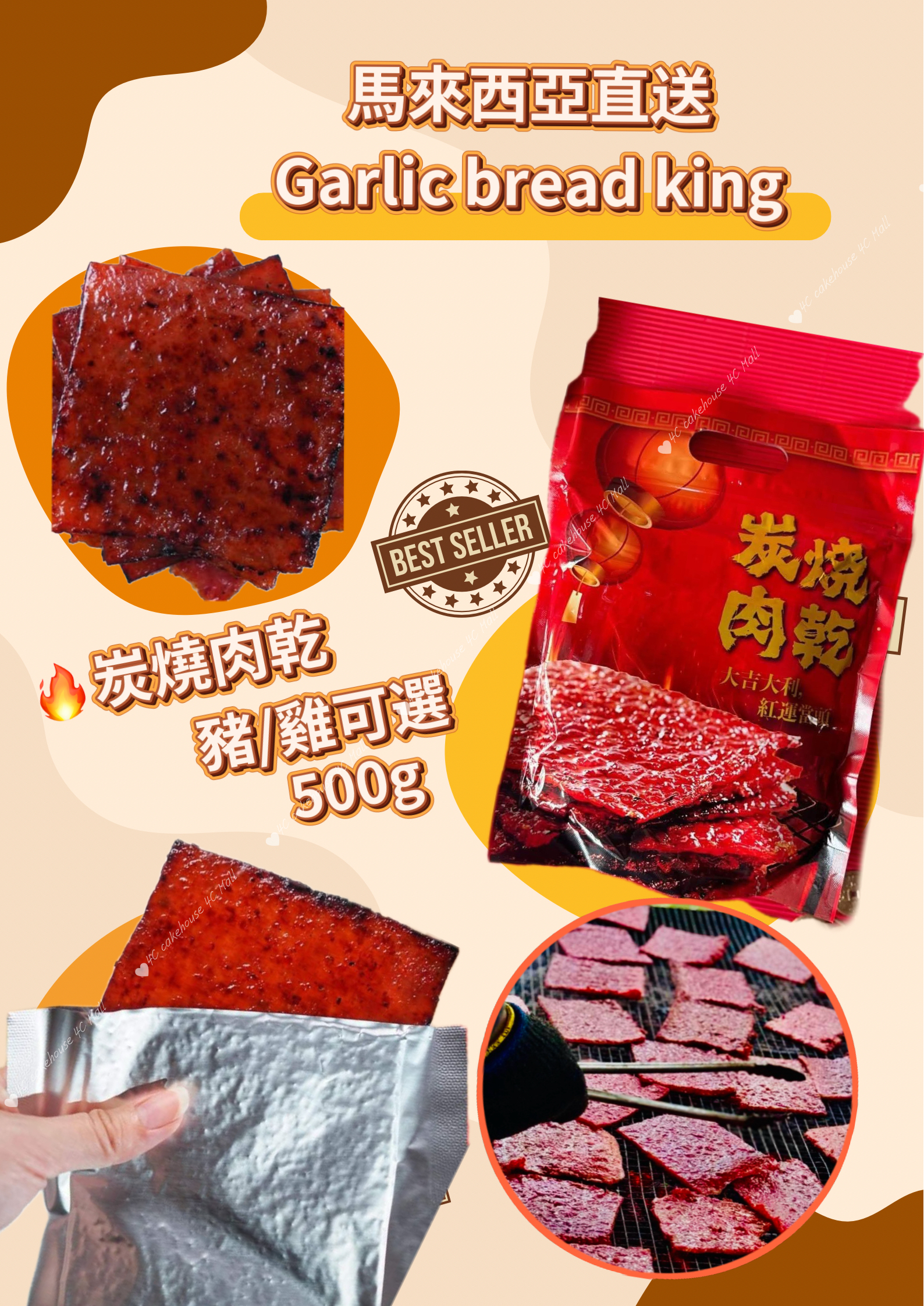 馬來西亞直送 Garlic bread king 🔥炭燒肉乾 📣豬/雞可選 🔗歡迎網站落單 今次為大家介紹另一款馬來西亞炭燒肉乾 亦都喺馬來西亞幾十年嘅老字號,即叫即燒保持新鮮!每一塊都有炭燒嘅香味👍🏻 想吃就吃,誰規定要等過年?! 😏 每一口都是 濃郁炭香+鮮嫩肉感,越嚼越香,欲罷不能🤤 🍞 夾進麵包,加點肉絲,直接 昇華成神級美食😋 ☕ 下午茶配上幾片,爽到飛起😋 嘴饞時隨手抓一片,幸福值瞬間爆表💯 ✅一包500g+ 一包大約有7至9片全部大大片視乎厚薄而定 💁♀️拿回去煎/烤一下搭配肉乾 也是嘎嘎好吃😋 📆保存日期常溫一個月 亦都可以選擇放喺雪櫃可以存放三個月 📆24/12 截 📆1月中後到