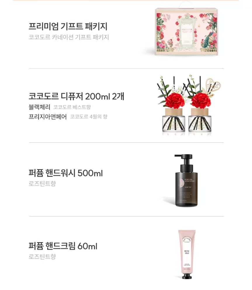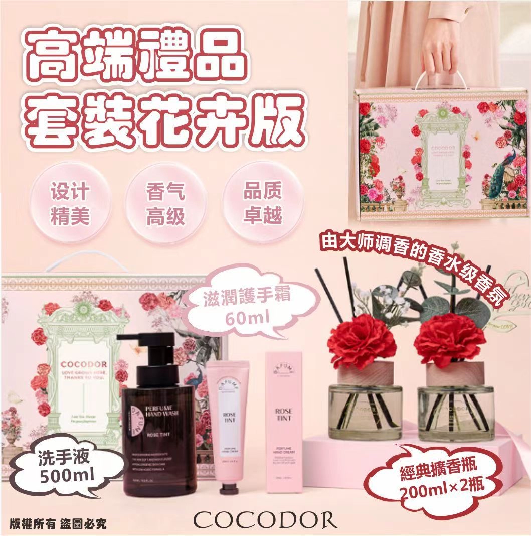 COCODOR 高端禮品套裝花卉版 令人難忘的特別禮物 高級禮品套裝 “讓香氣給予您感官的慰藉” 我們將自然饋贈的安寧與愉悅悉心封存,請您感受這直抵心靈深處的芬芳。 通過COCODOR獨有的深邃香調,為您找回日常生活的平衡與寧靜。 · 體面周全:禮盒內含空間香氛與個人洗護,品類搭配合理,滿足收禮人多場景使用需求,顯得格外貼心。 · 品質卓越:延續COCODOR品牌20年以上的調香專業技藝,所有產品均採用精選香原料與安心成分。 · 香氣高級:由大師調香的香水級香氛,絕非普通香精可比,能持久營造高品質的生活氛圍。 · 設計精美:整體包裝優雅大方,自用提升幸福感,送禮則彰顯不凡品味。 內容: COCODOR 經典擴香瓶 200ml× 2瓶 · 【黑櫻桃】:熟透的黑櫻桃之豐潤甘甜,與清新青蘋果相遇,細膩平衡,溫柔觸動感官。 · 【梨花與小蒼蘭】:潔白的弗里西亞花明亮細膩的芬芳,與英國梨的柔軟甘甜交織融合,優雅而迷人。 COCODOR 洗手液 · 500ml ** × 1瓶 · 香型:玫瑰色調 · 帶來豐富綿密泡沫,即使頻繁洗手,也能保持雙手水潤柔滑不乾燥。溫暖優雅的玫瑰香氣在洗手後依舊持久縈繞,為您點亮一整天的好心情。 COCODOR滋潤護手霜 · 60ml ** × 1支 · 香型:玫瑰色調 · 奢華香氣與持久保濕力相結合,為您從指尖開始,獻上細膩的放鬆與休憩時刻。