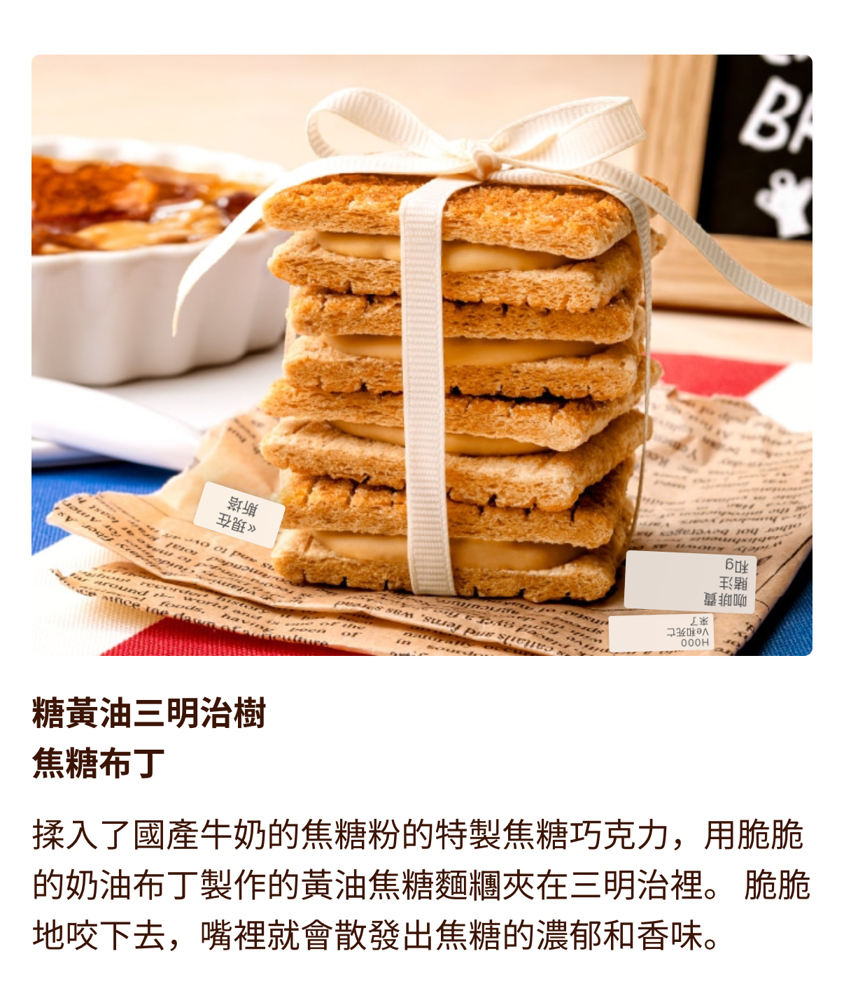 揉入了國產牛奶的焦糖粉的特製焦糖巧克力,用脆脆的奶油布丁製作的黃油焦糖麵糰夾在三明治裡。 脆脆地咬下去,嘴裡就會散發出焦糖的濃郁和香味。