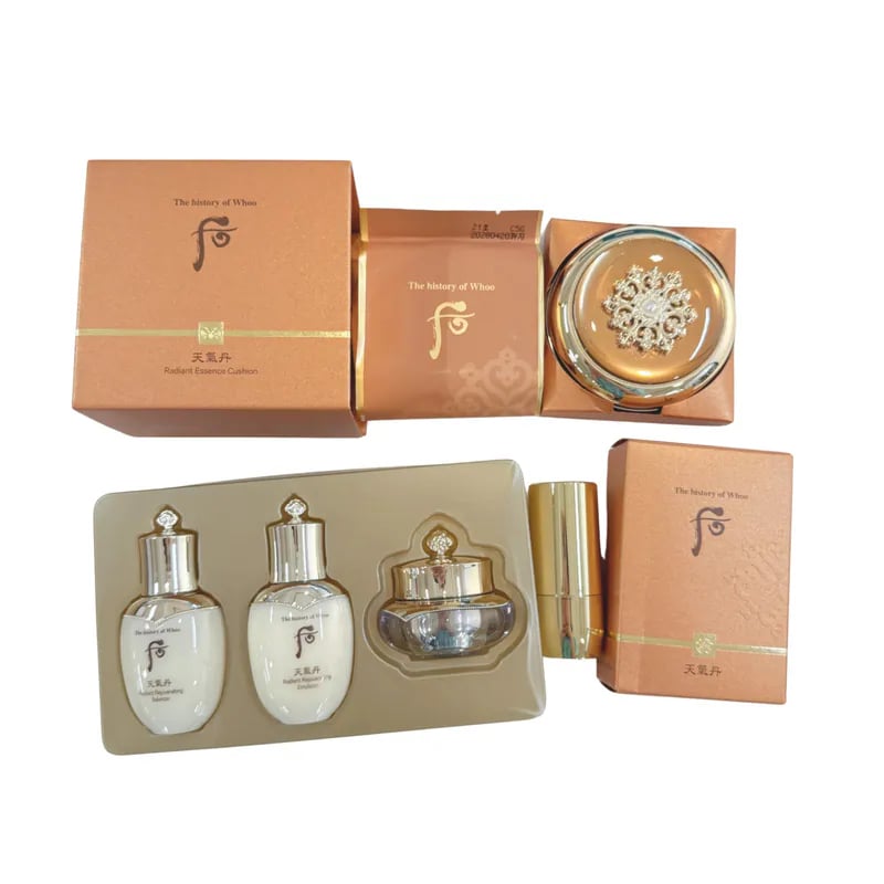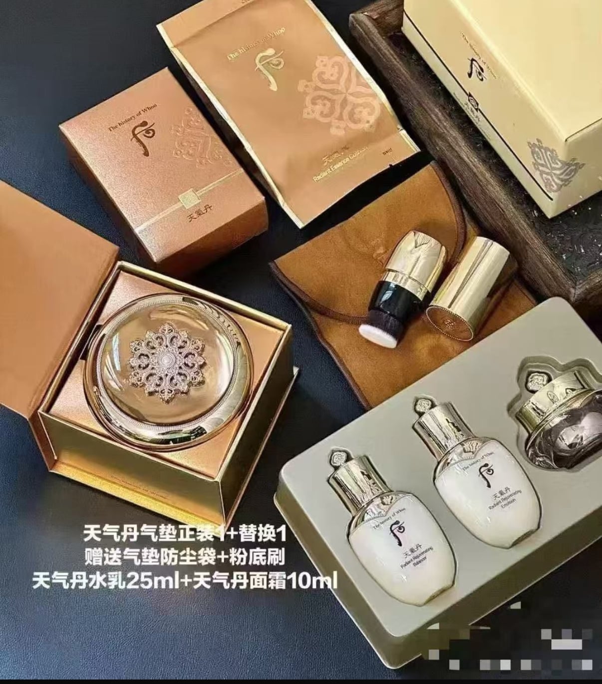 韓國直送少量現貨 Whoo天氣丹華炫雙層蕾絲氣墊粉底套限量套裝 三至五天出貨 🔗歡迎網站落單 套盒含有: 天氣丹氣墊正表1+替換1 顏色21色 贈送氣墊防塵袋+粉底刷 天氣丹水乳25ml+天氣丹面霜10m 產品類別 : 天氣丹, 氣墊粉底 , 活力透亮 , 細紋 / 皺紋 , 亮白 / 淡斑 , 防曬 琥珀色的包裝,配上蕾絲狀金屬設計,中心還鑲了一顆別緻的珍珠,天氣丹 華炫雙層蕾絲氣墊粉底是一款「無海綿」的氣墊粉底,內層以牡丹花蕾絲圖騰彈性網,將粉底液及粉撲分阻,比傳統海綿氣墊粉底更衛生,蘊含的粉底液份量更多。彈性網及低粘性粉底液之間,有一層具防臭、抗菌及防水分蒸發功能的「超粘合織物過濾層」分隔,加上「跨度抽送技術TM 」,令每一滴粉底液都能輕易地抽出,而且沾取的分量更平衡,不論第一滴到最後一滴都仍能保持最佳的濕潤狀態,令每一個妝容都持久貼薄,散髮自然水嫩透亮光澤。